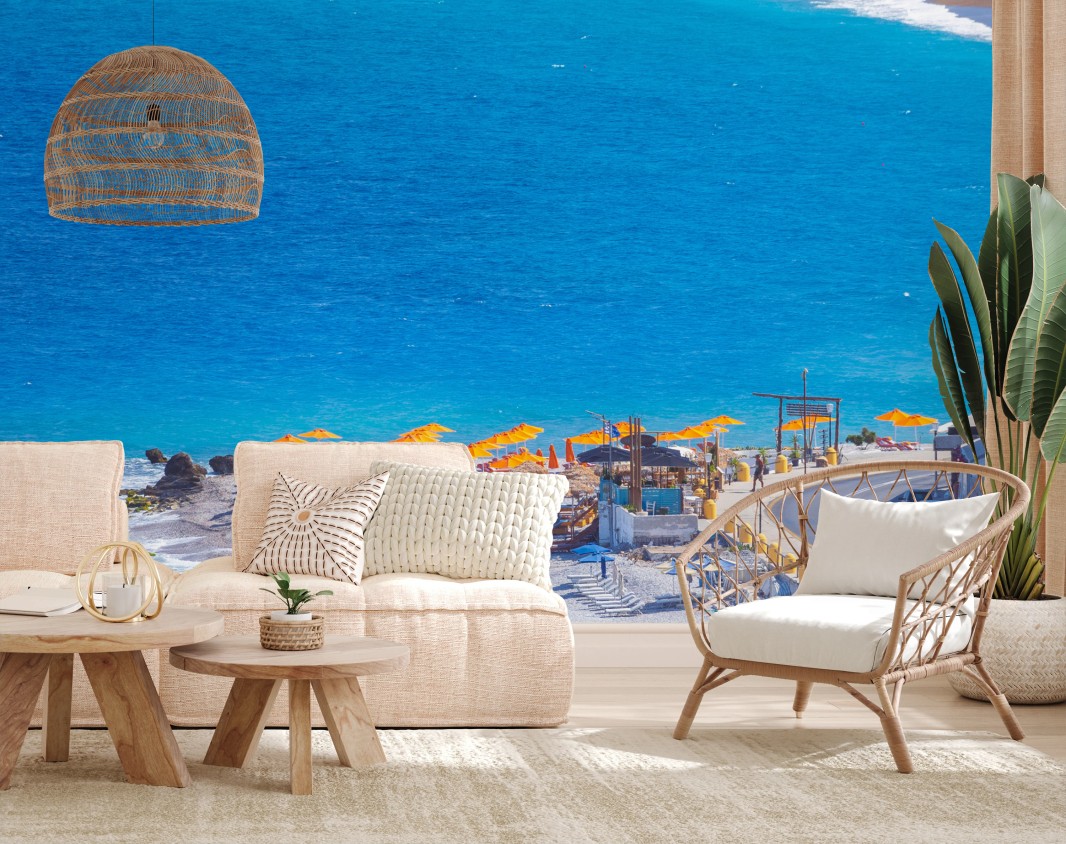 Fototapete Rhodos strand mit bunten sonnenschirmen
