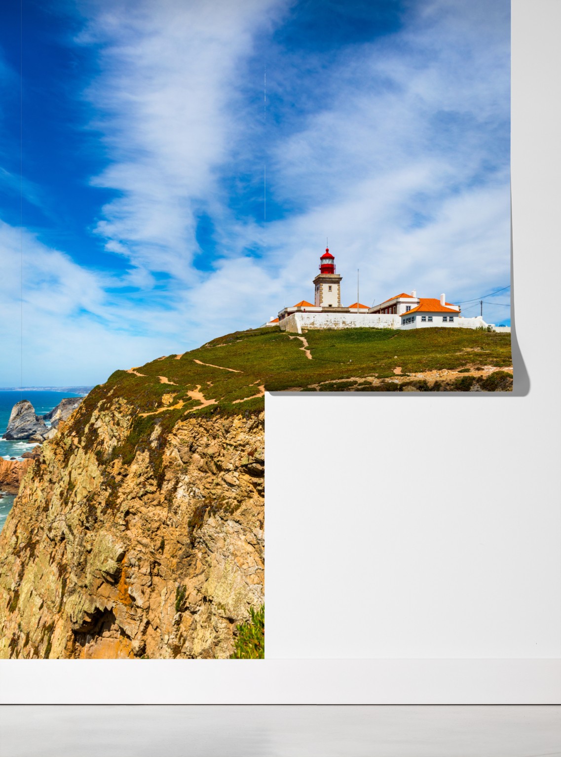 Erleben Sie die eindrucksvolle Küstenlandschaft von Cabo da Roca mit dieser lebendigen Aufnahme eines Leuchtturms, die jedem Raum Meeresatmosphäre verleiht.