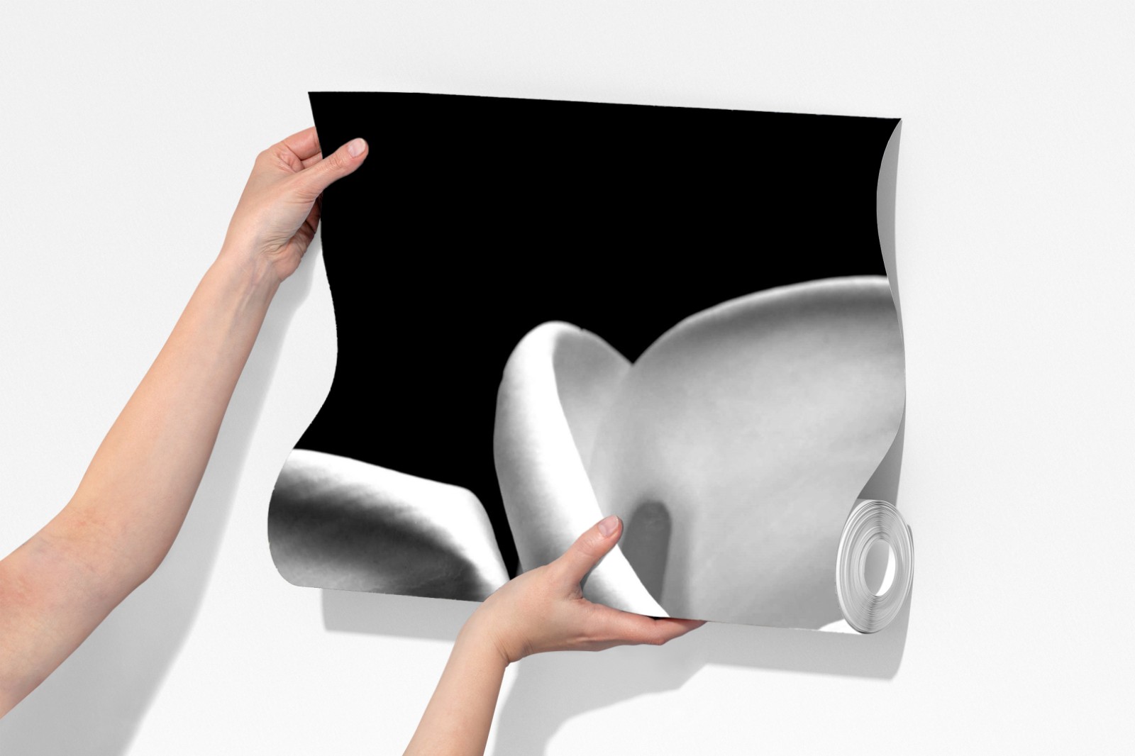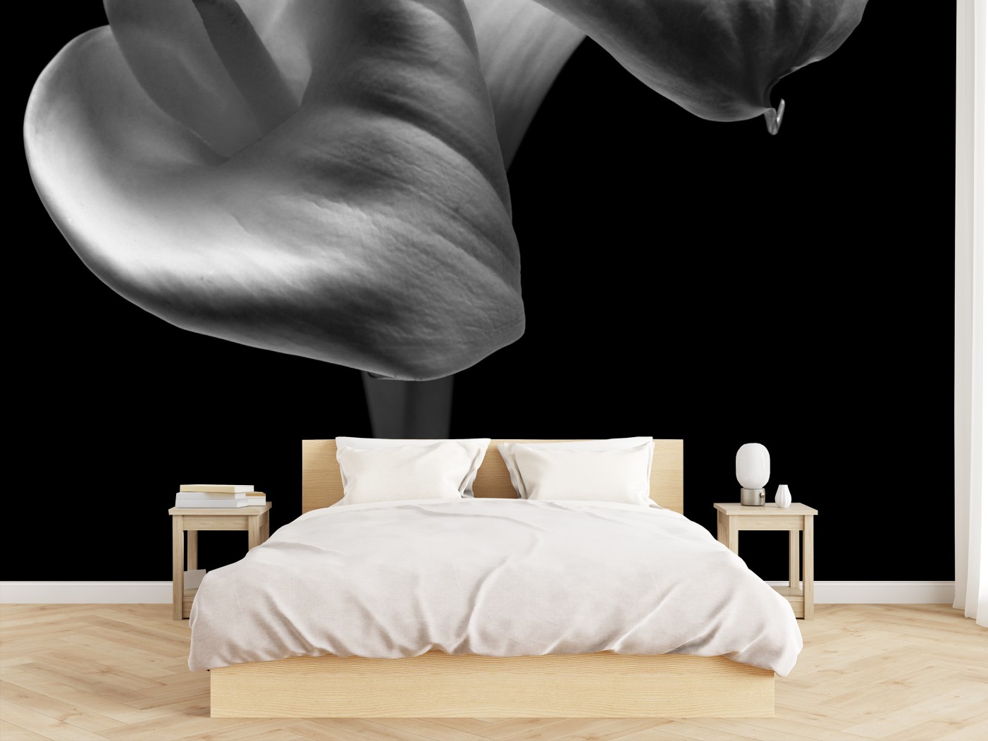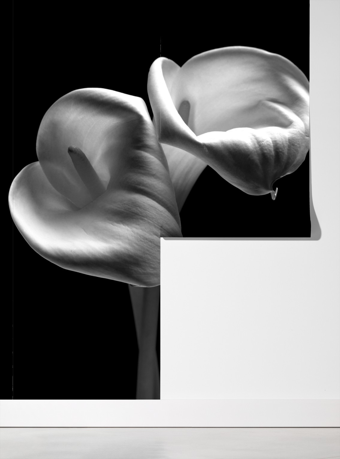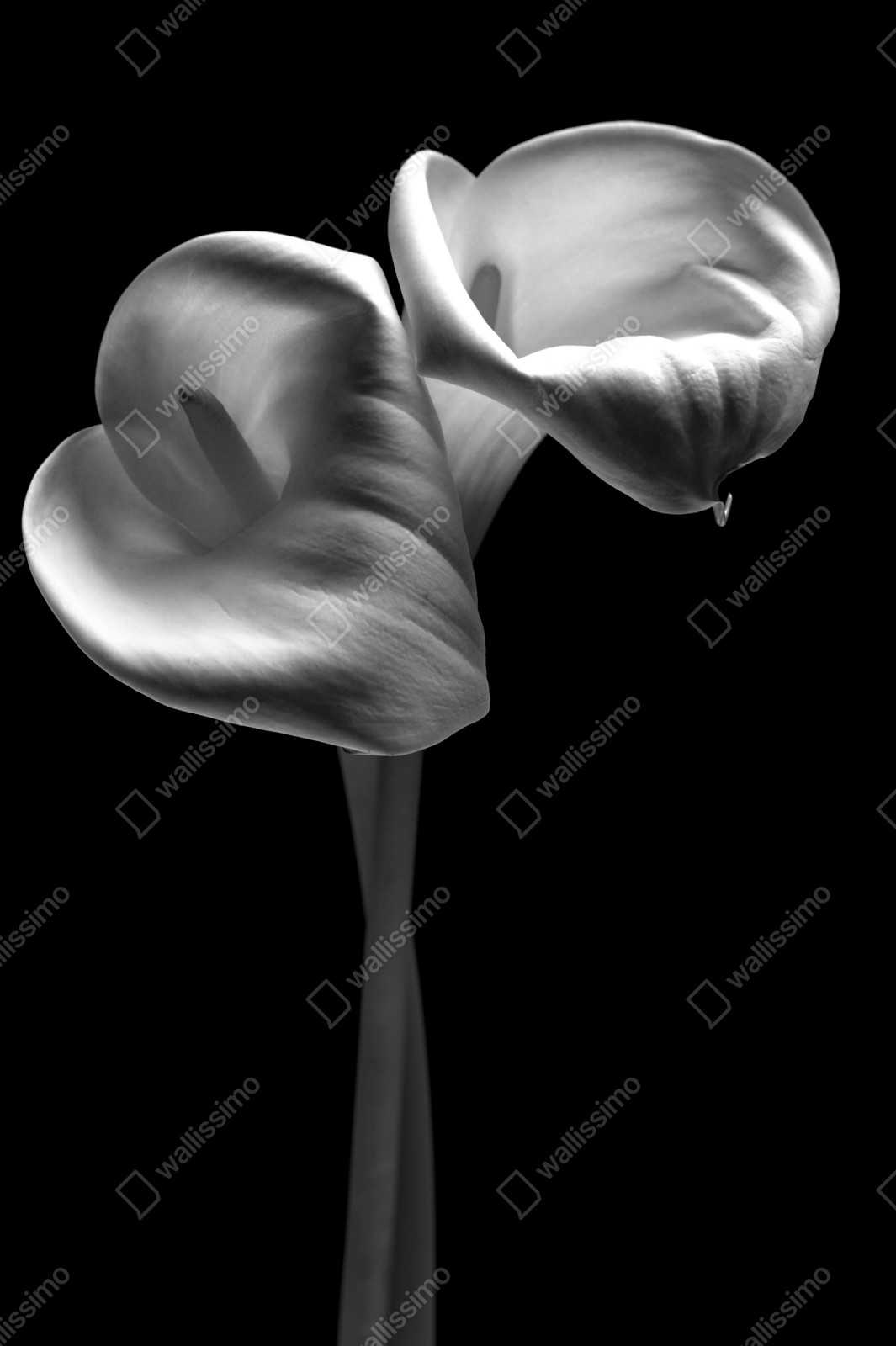 Bringen Sie pure Eleganz an Ihre Wand mit dieser Schwarzweißaufnahme von Calla-Blüten, ideal für moderne, minimalistische Räume.