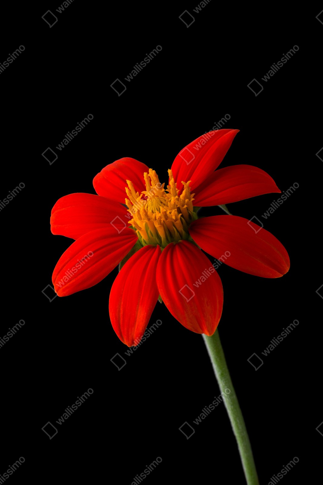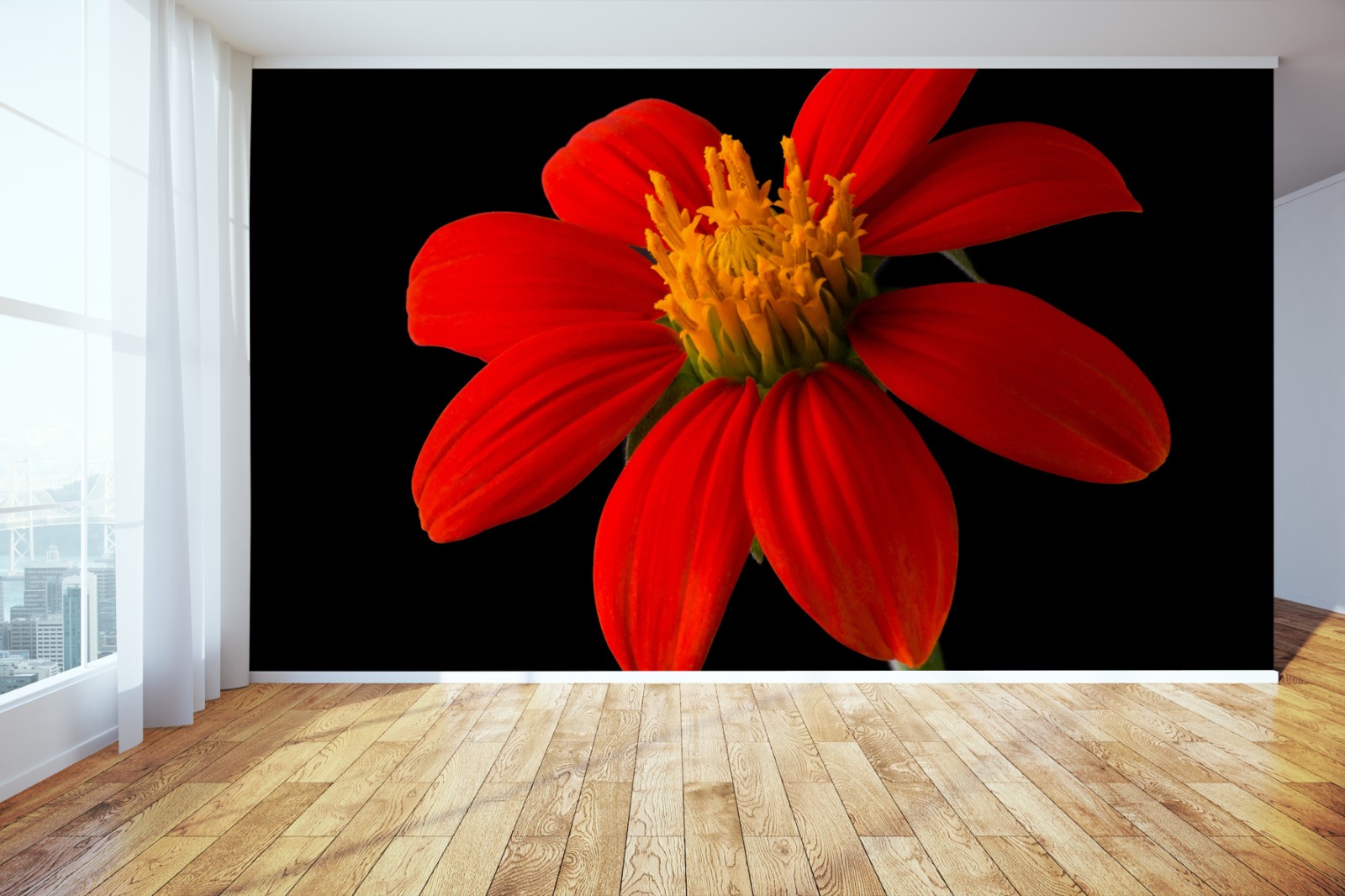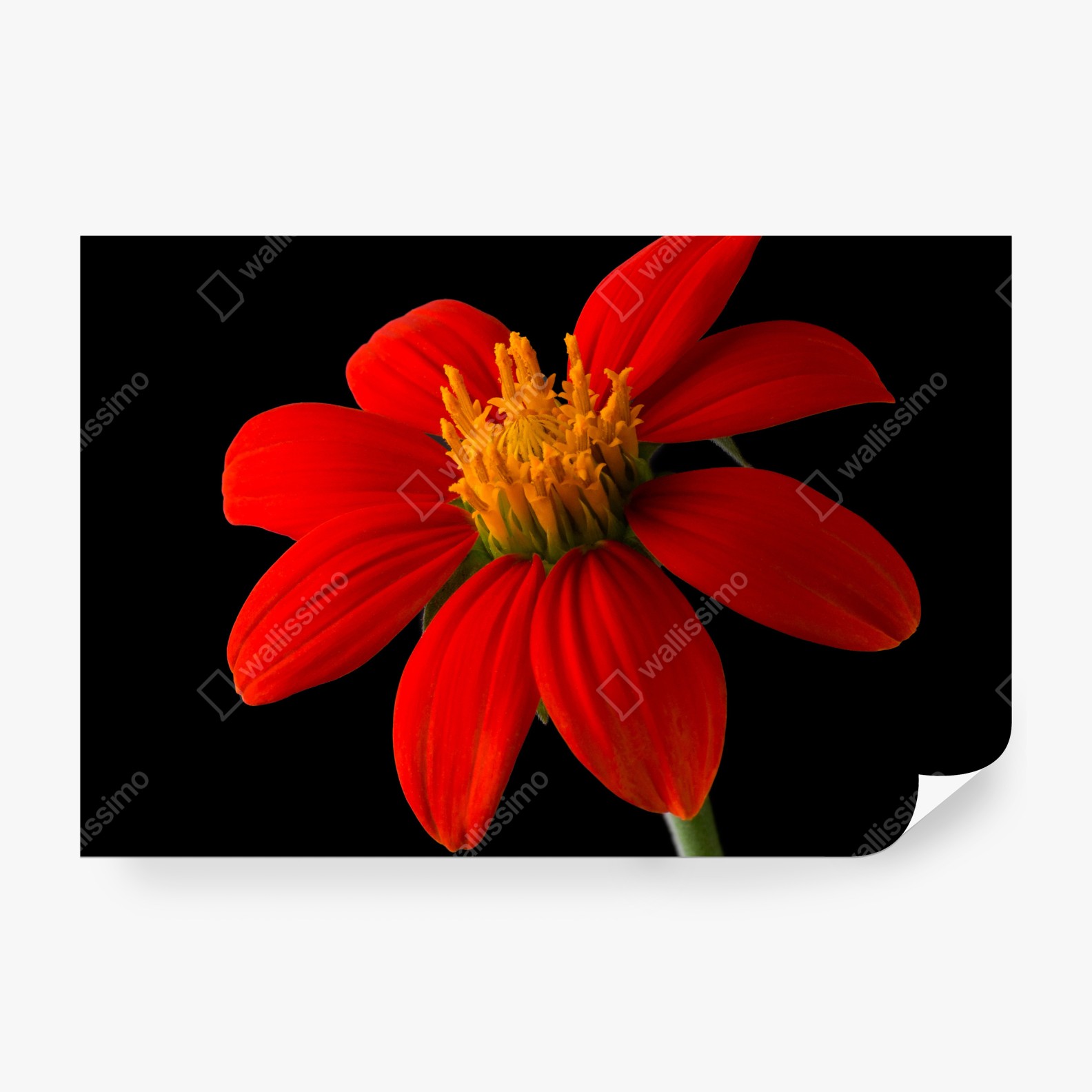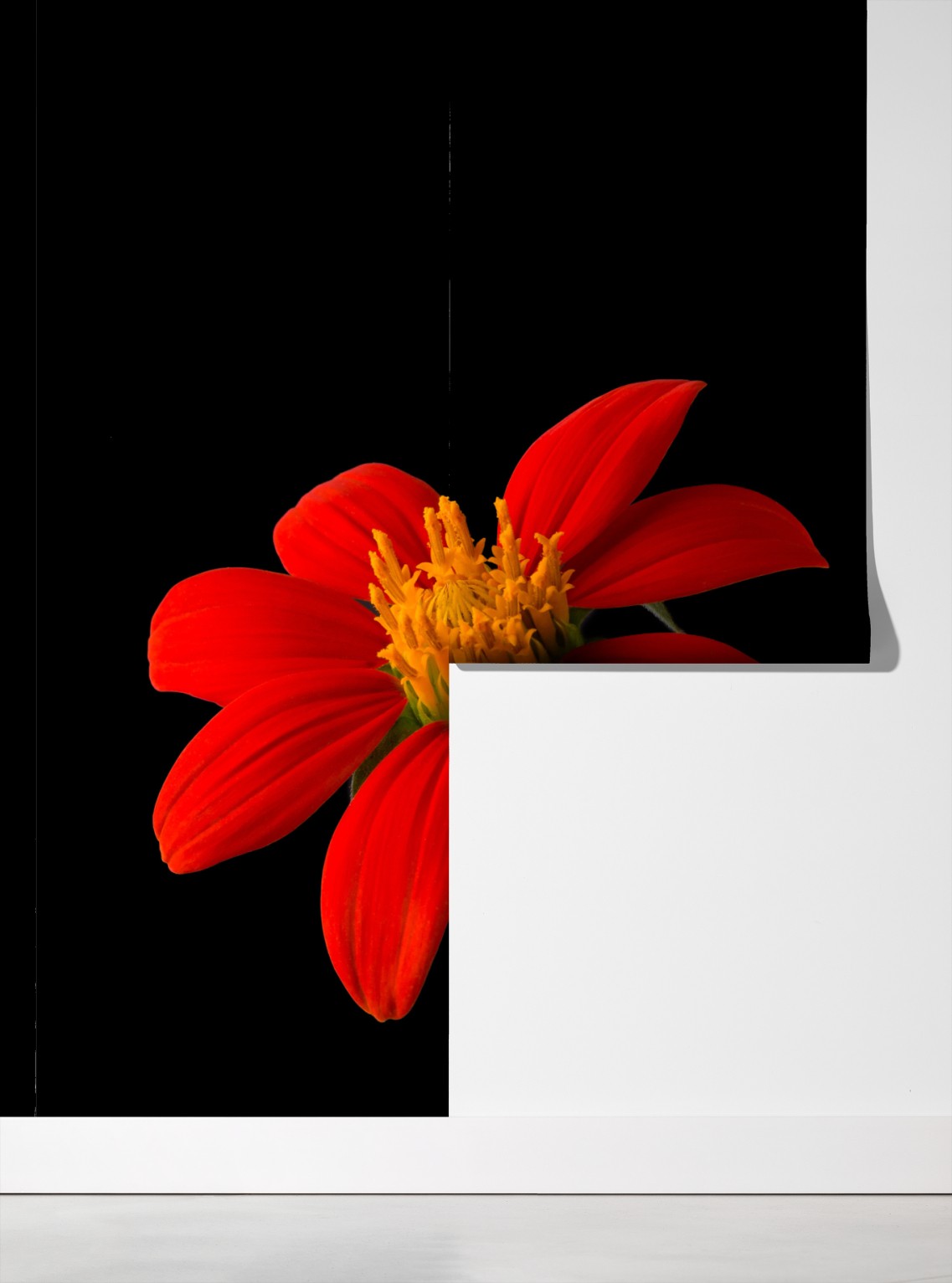 Die leuchtend rot-orangene mexikanische Sonnenblume auf tiefschwarzem Hintergrund verleiht jeder Wand eine kraftvolle botanische Eleganz.