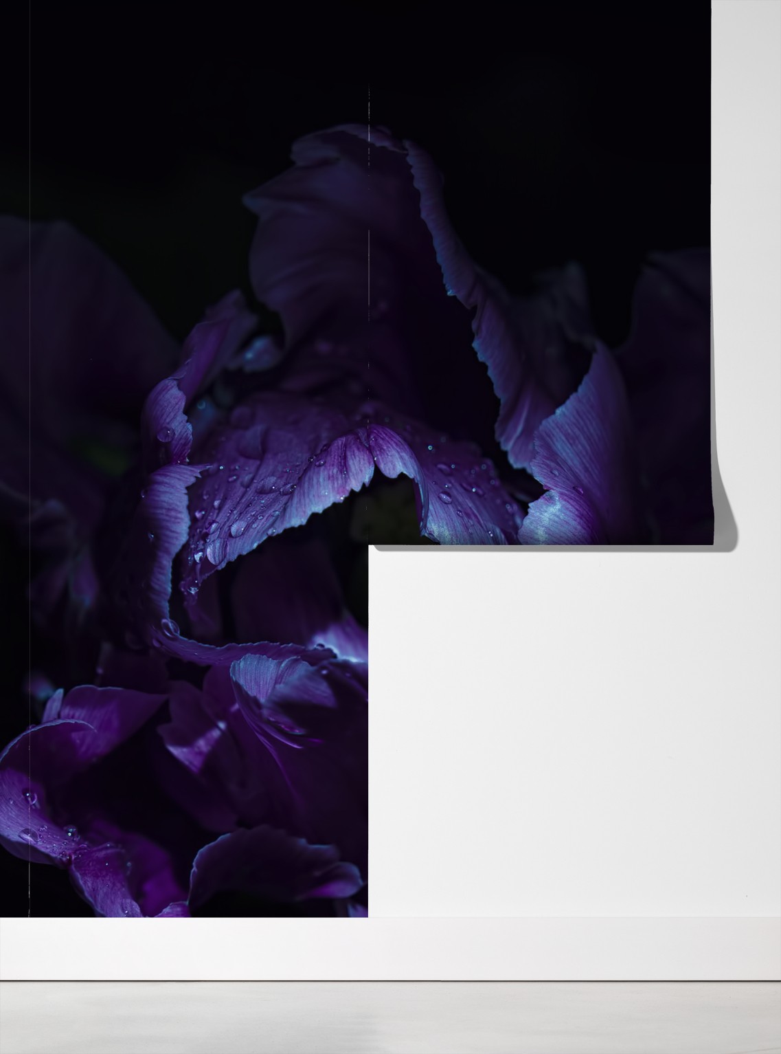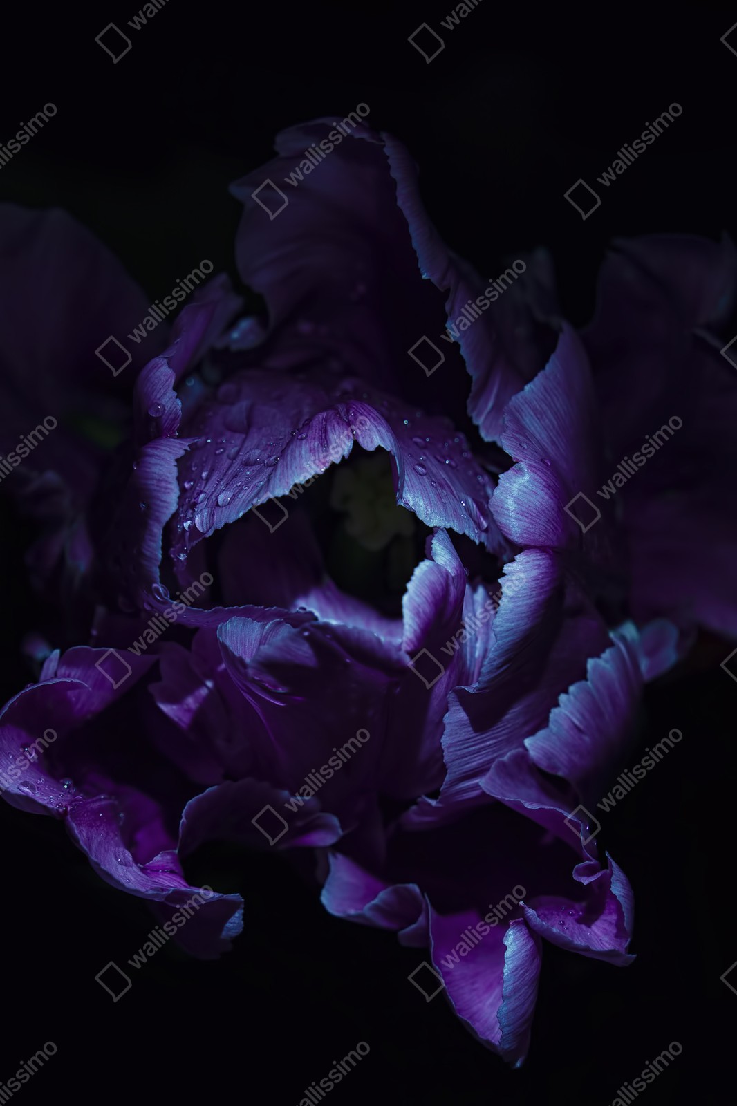 Bringen Sie dramatische florale Schönheit in den Raum mit einer Nahaufnahme einer lila Tulpe im ultravioletten Licht, die Tautropfen und feine Texturen vor dunklem Hintergrund hervorhebt.