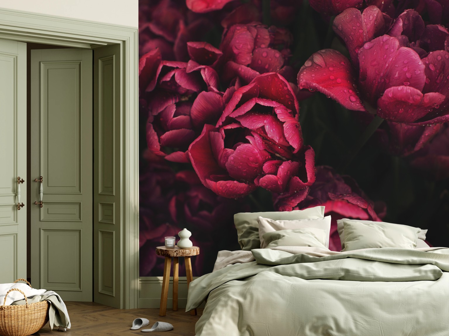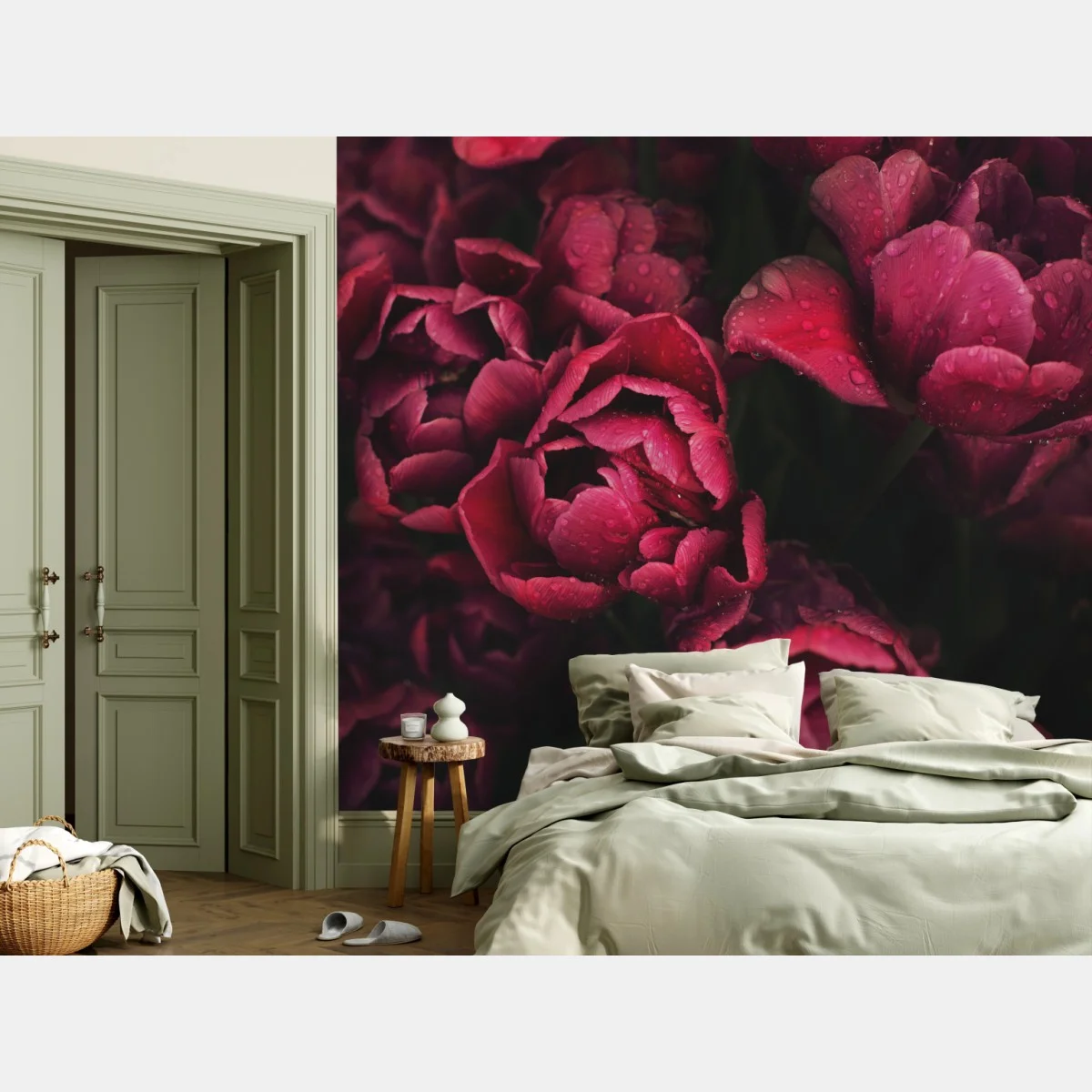 Fototapete Tiefrote blüten mit wassertropfen