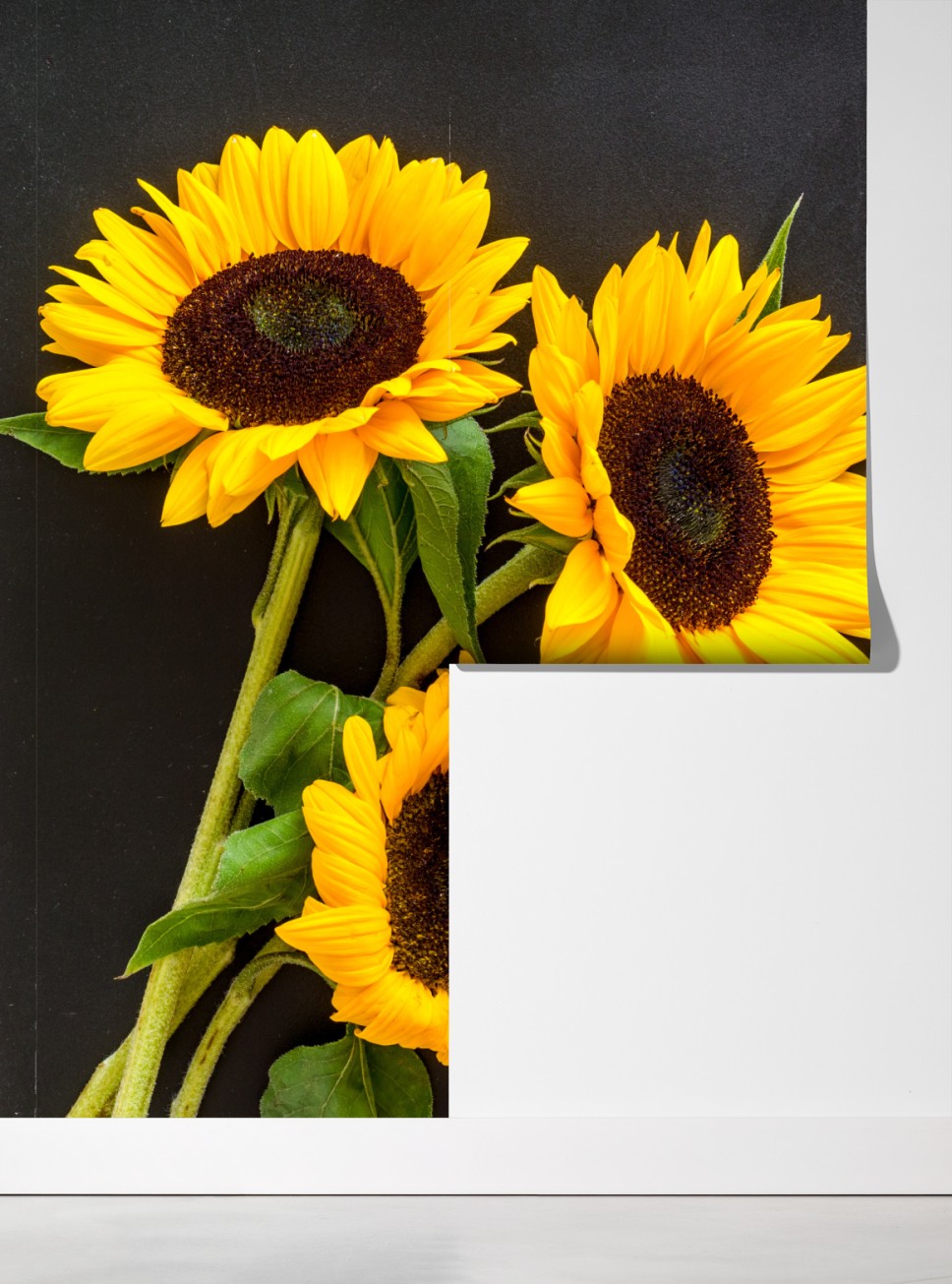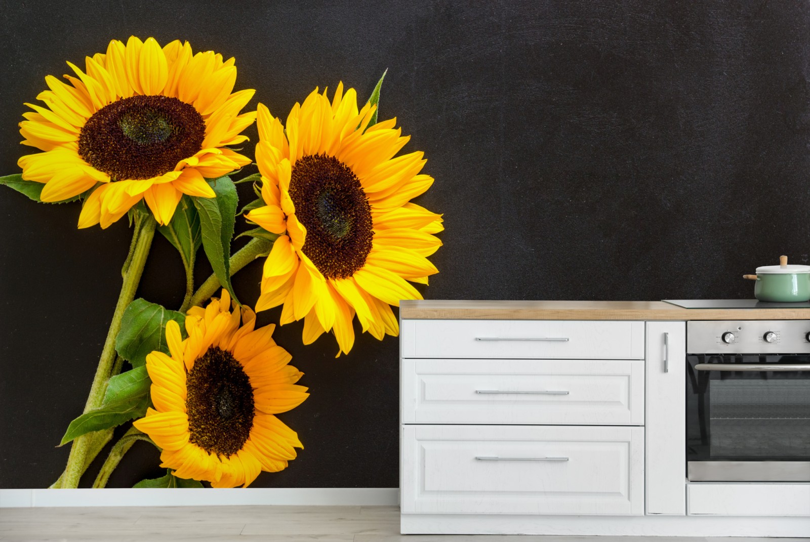 Helle sonnenblumen vor dunklem hintergrund verleihen jedem raum warme, natürliche schönheit.