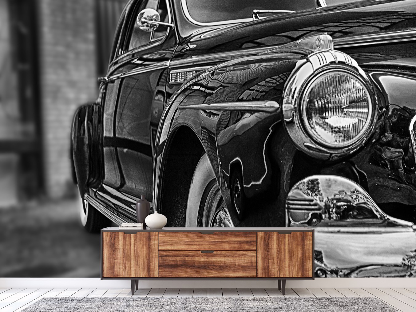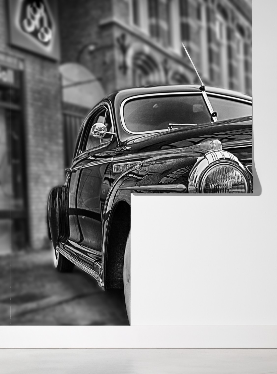 Bringen Sie zeitlose Eleganz in Ihr Zuhause mit dieser eindrucksvollen schwarz-weißen Aufnahme eines vintage klassischen Autos auf Kopfsteinpflaster.