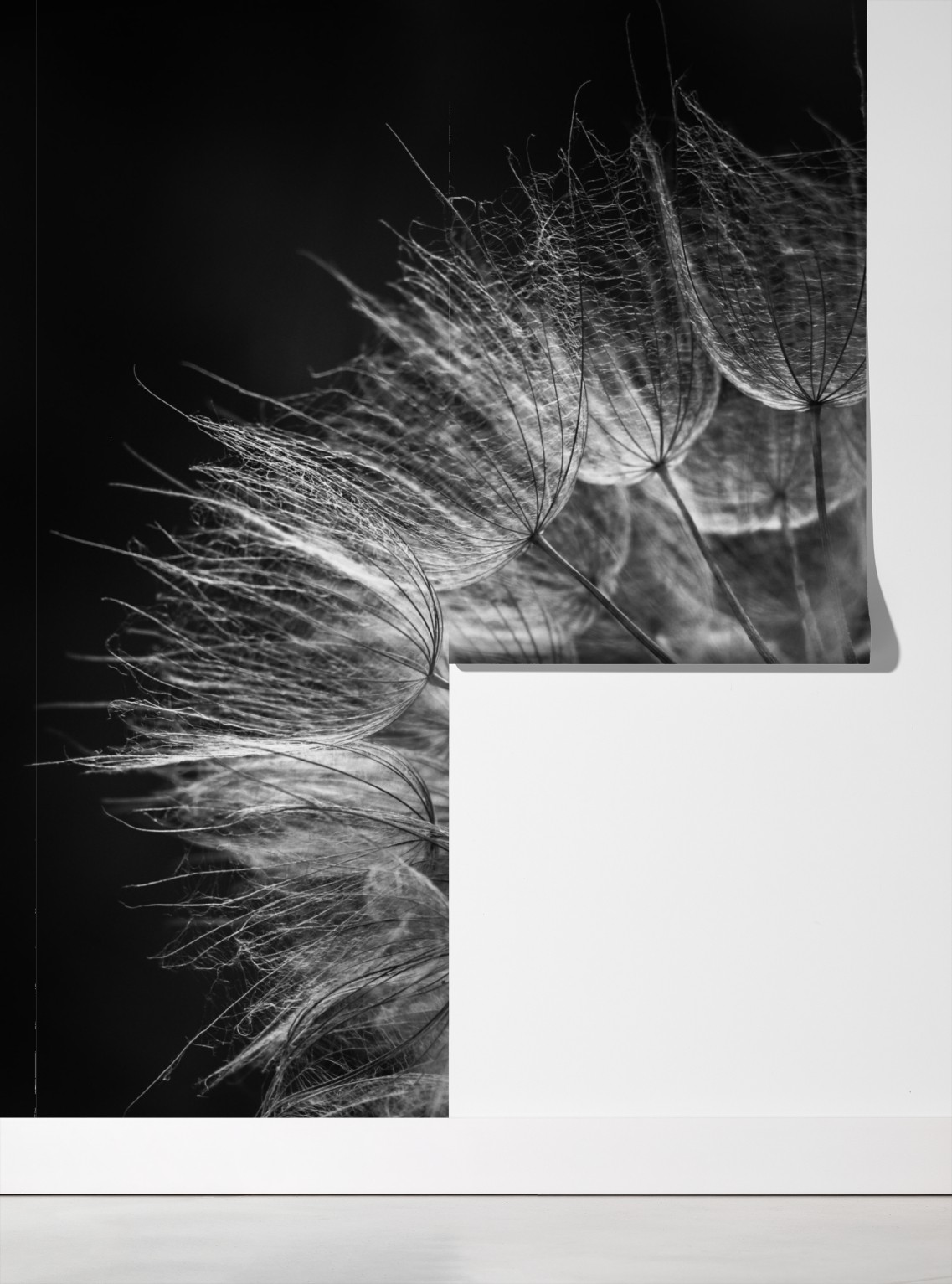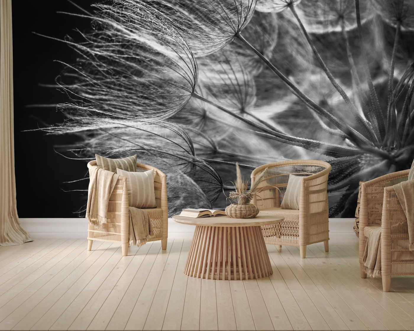 Zartes Schwarzweiß-Makro eines Löwenzahns, das subtile botanische Eleganz an Ihre Wand bringt.