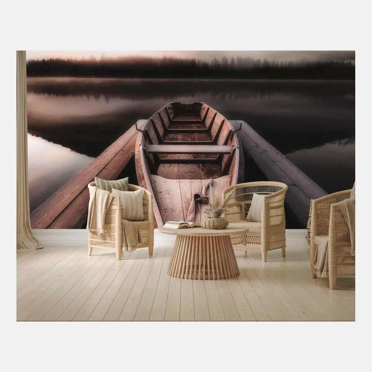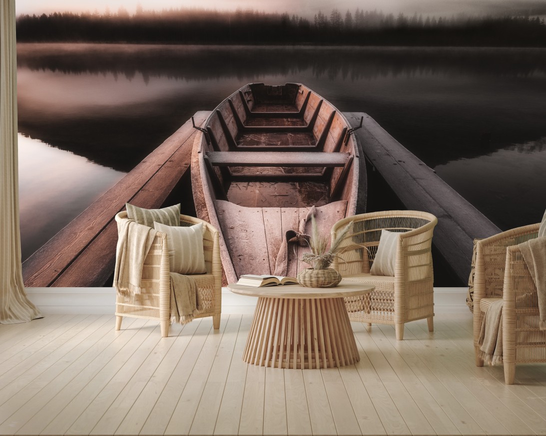 Fototapete Nebliges boot am bergsee