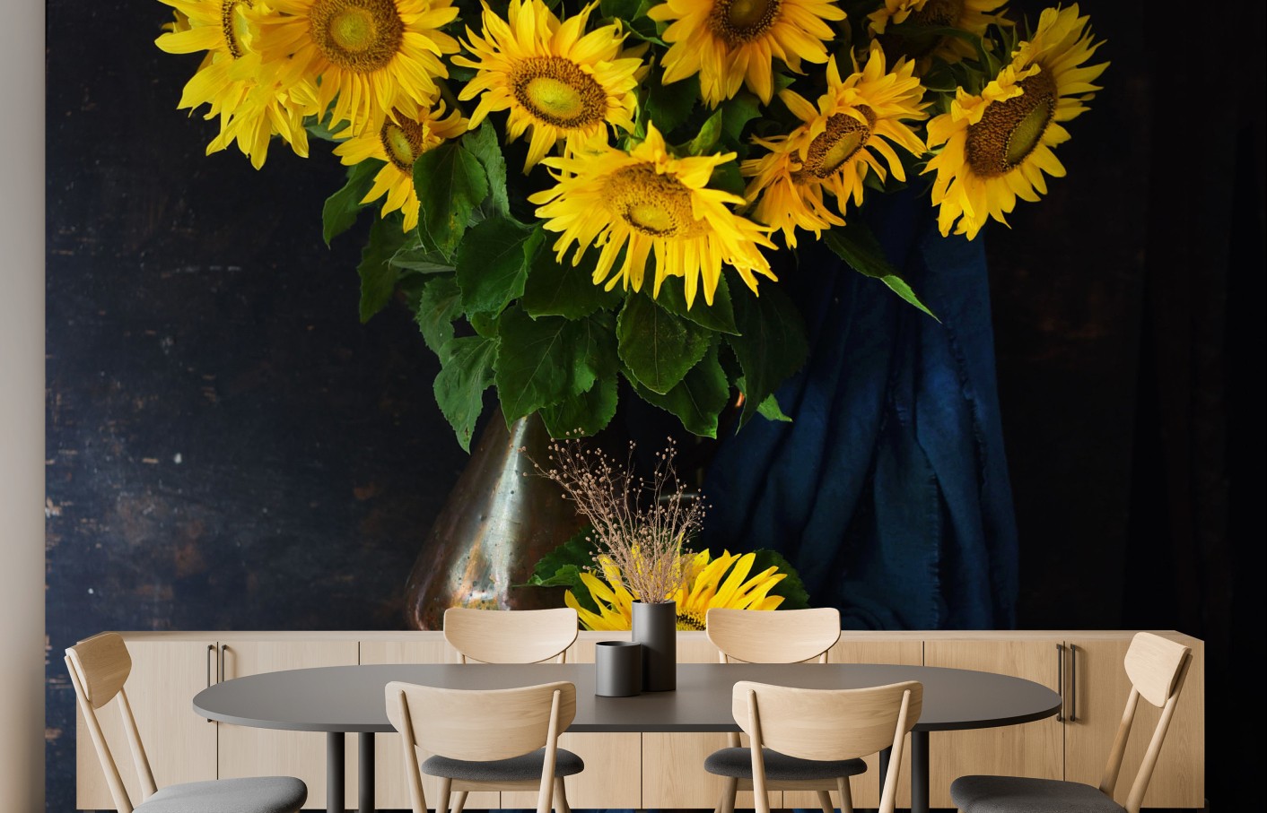 Verleihen Sie Ihren Wänden rustikalen Charme mit diesem leuchtenden Sonnenblumen-Stillleben, das jedem Raum warme, natürliche Akzente verleiht.