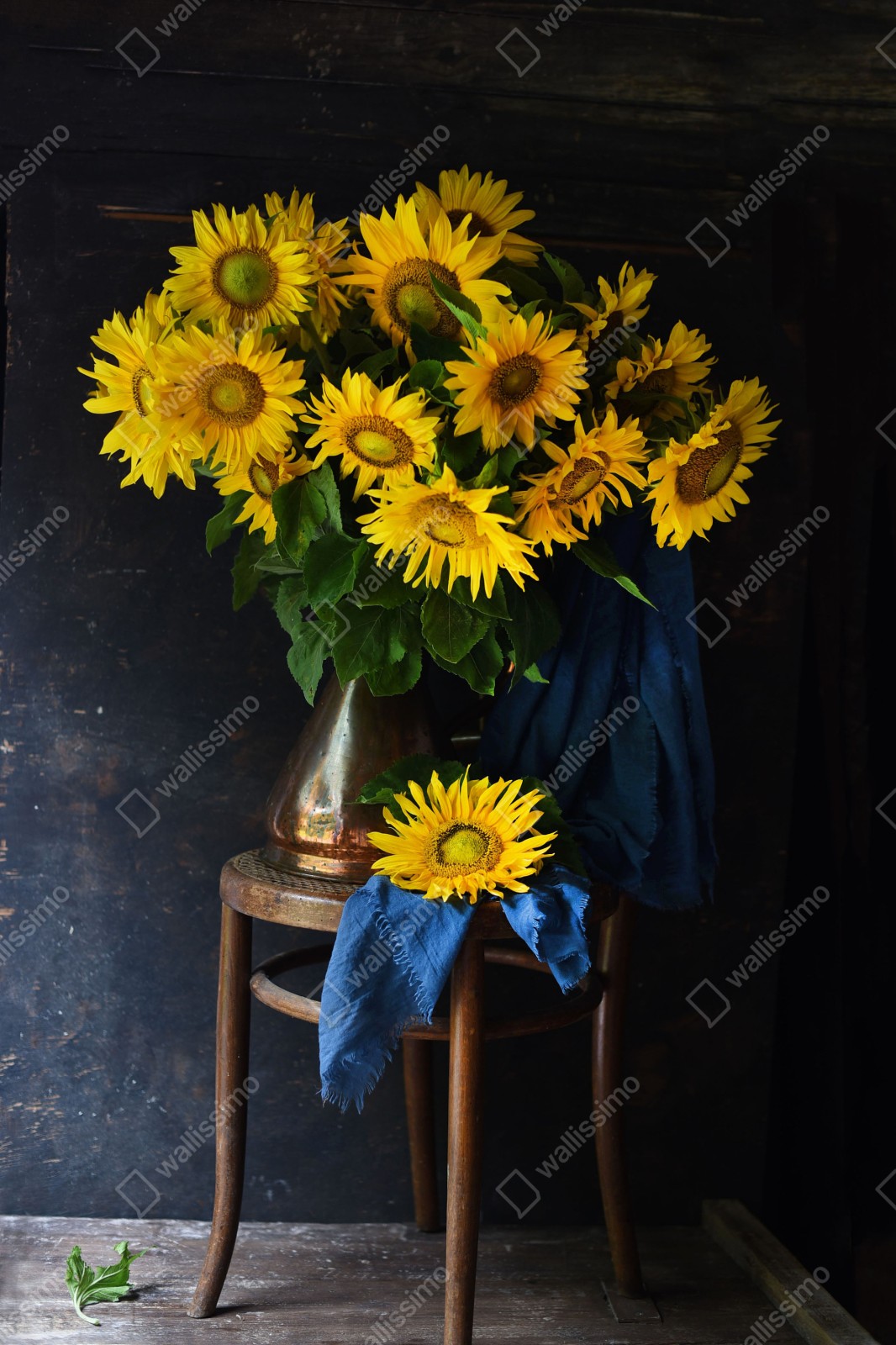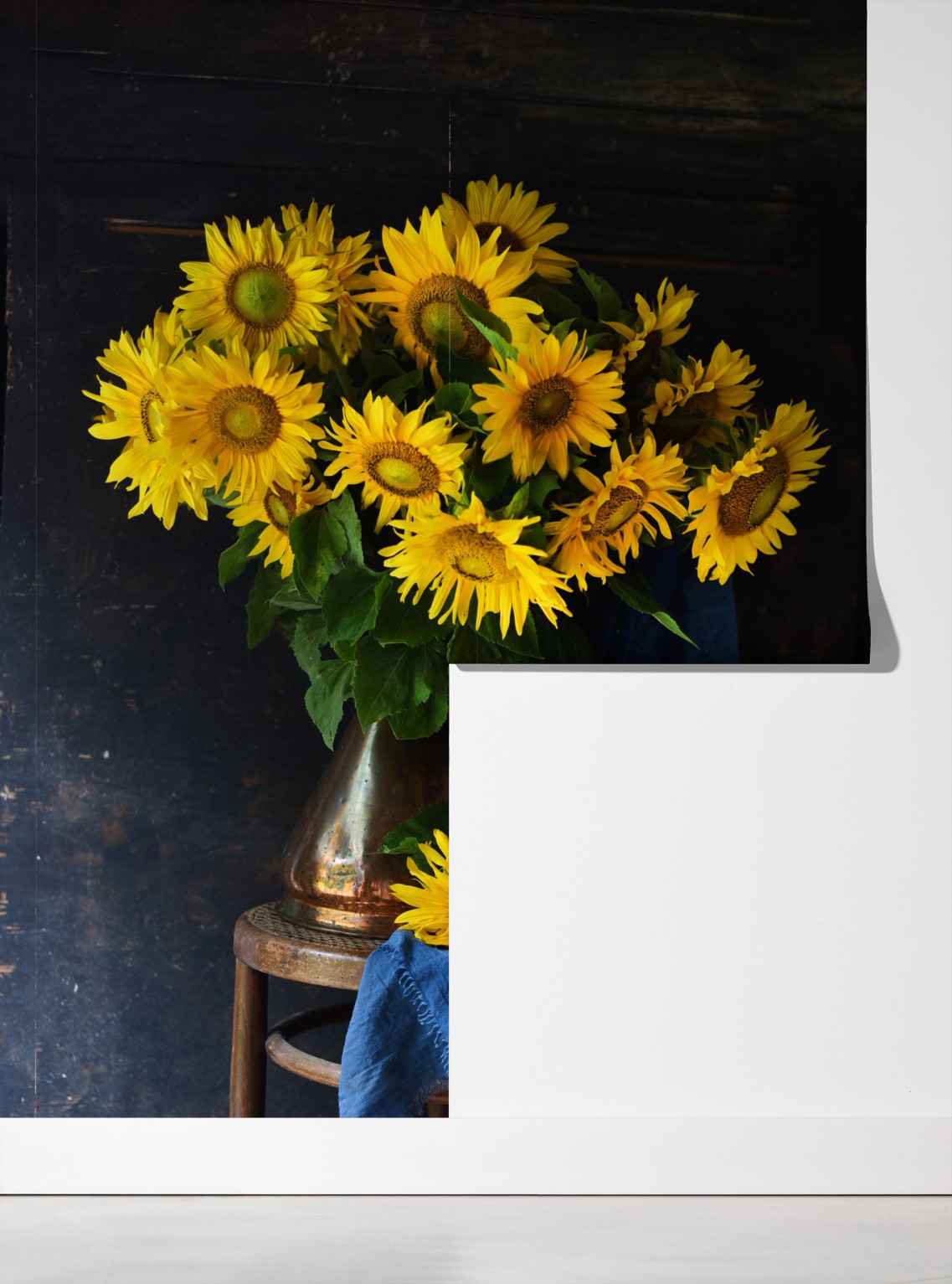 Fototapete leuchtender sonnenblumenstrauß auf vintage-hocker