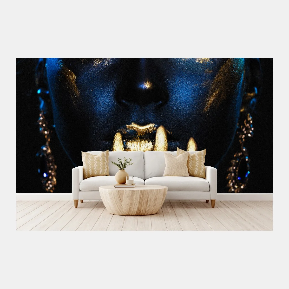 Beleuchten Sie Ihren Raum mit einem markanten Porträt, das tiefe Blautöne und metallische Goldakzente für ein mutiges, modernes Statement verbindet.MehrWeniger