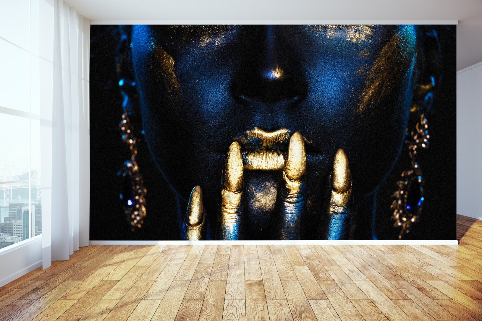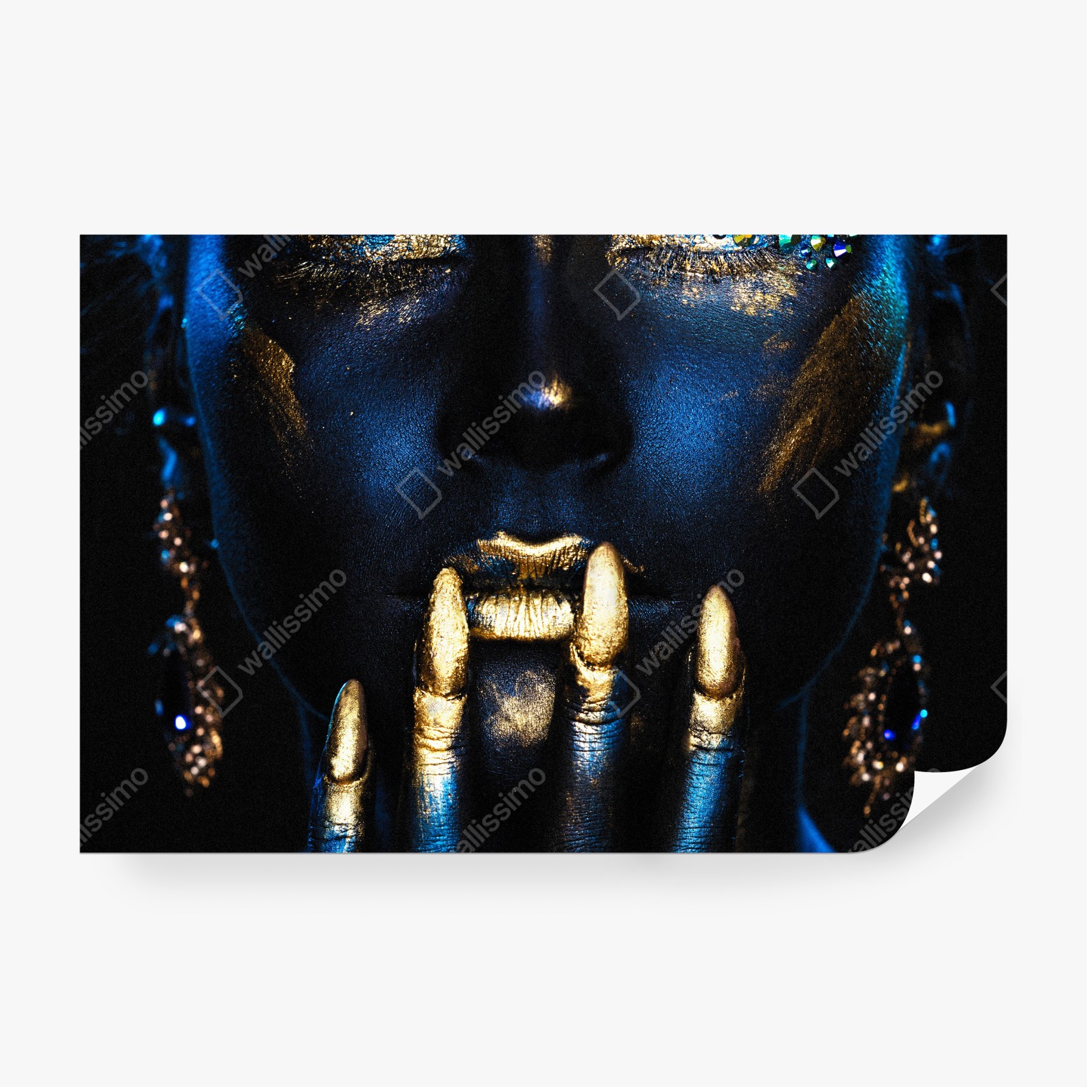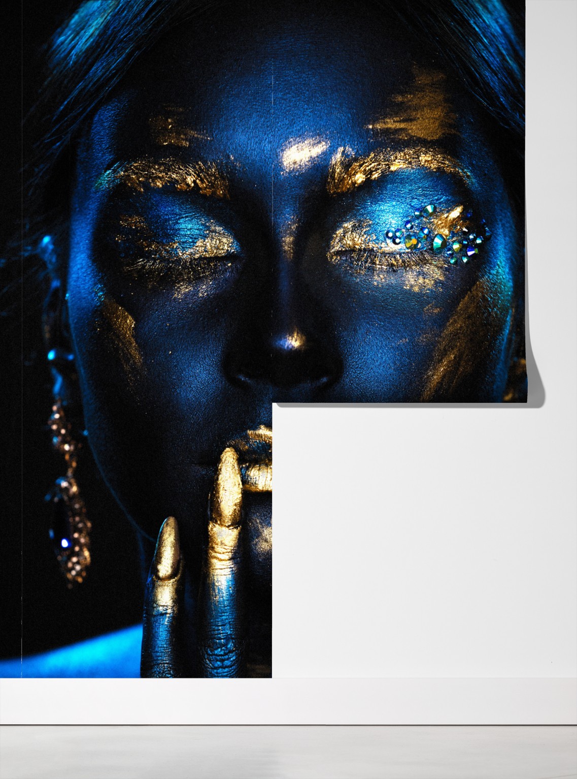 Beleuchten Sie Ihren Raum mit einem markanten Porträt, das tiefe Blautöne und metallische Goldakzente für ein mutiges, modernes Statement verbindet.