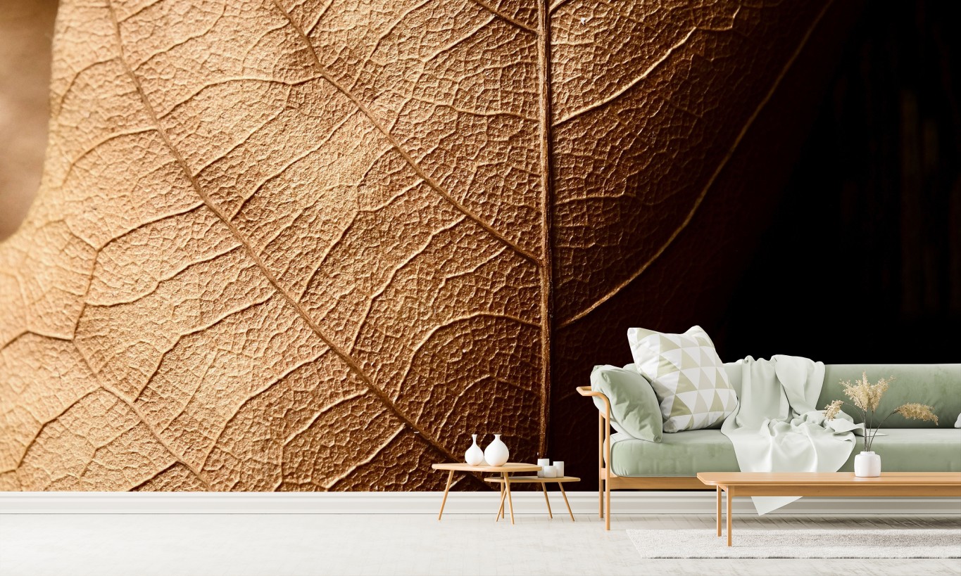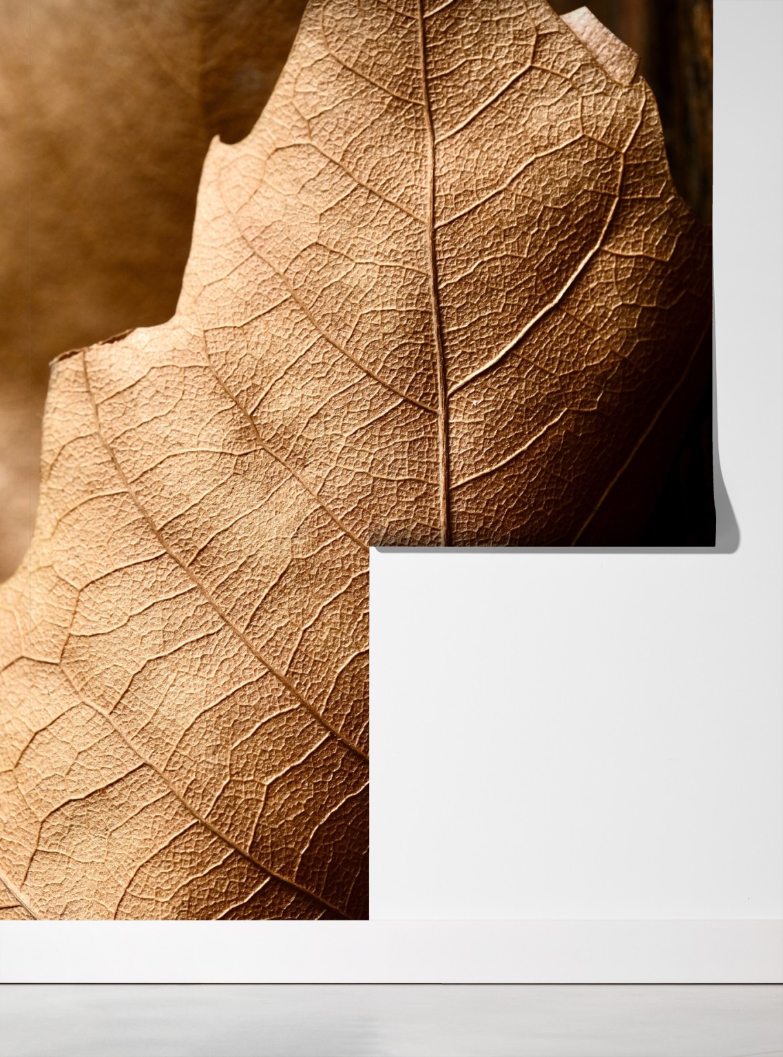 Bringen Sie natürliche Textur und Wärme in Ihren Raum mit dieser detaillierten Nahaufnahme eines getrockneten Blattes. Perfekt für Wohnzimmer oder Büro.