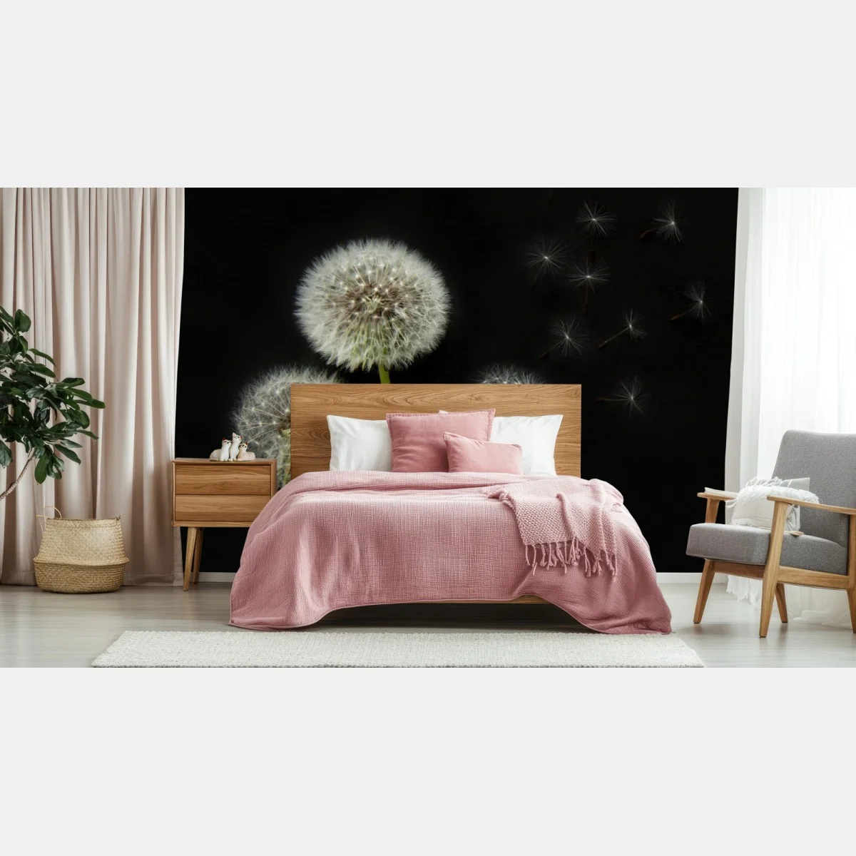 Fototapete Zarte löwenzahnköpfe vor schwarzem hintergrund