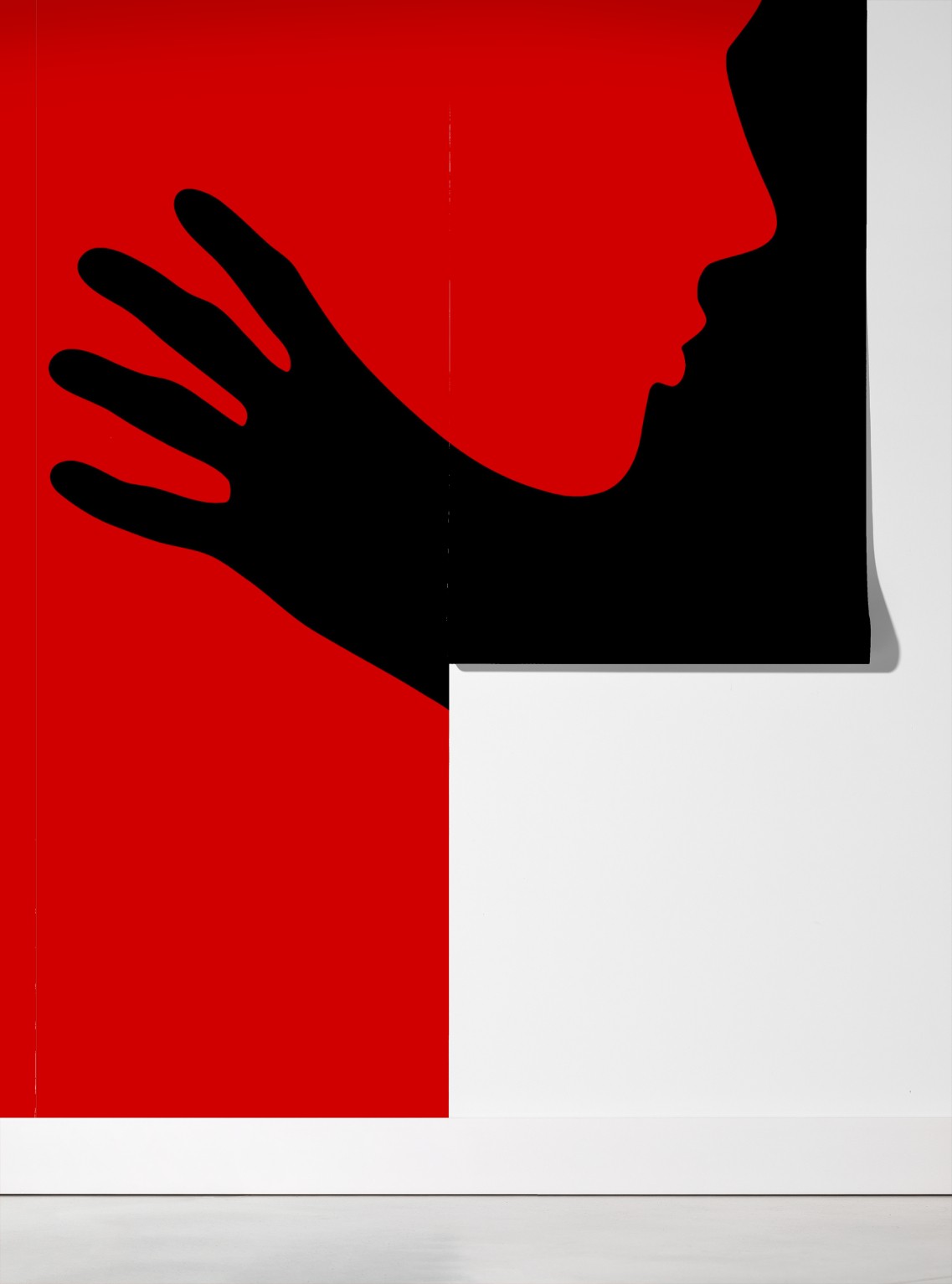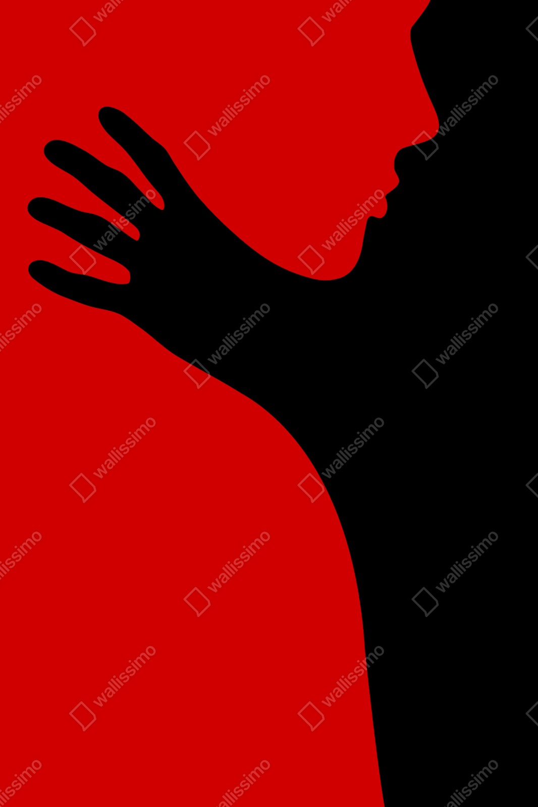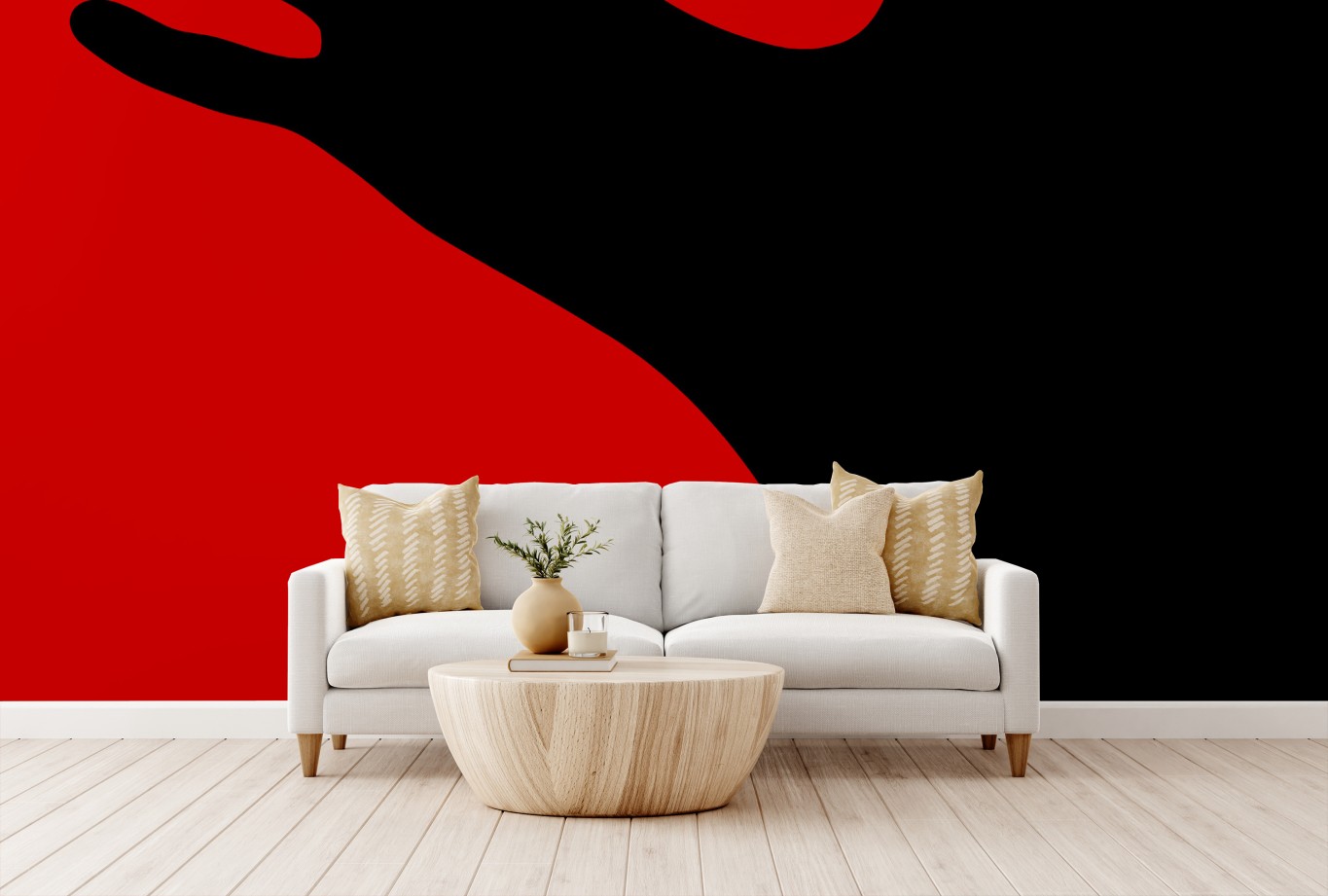 Auffälliges minimalistisches Kunstwerk mit kräftigen rot-schwarzen Silhouetten, das einen dramatischen und emotionalen Blickfang für jeden Raum schafft.