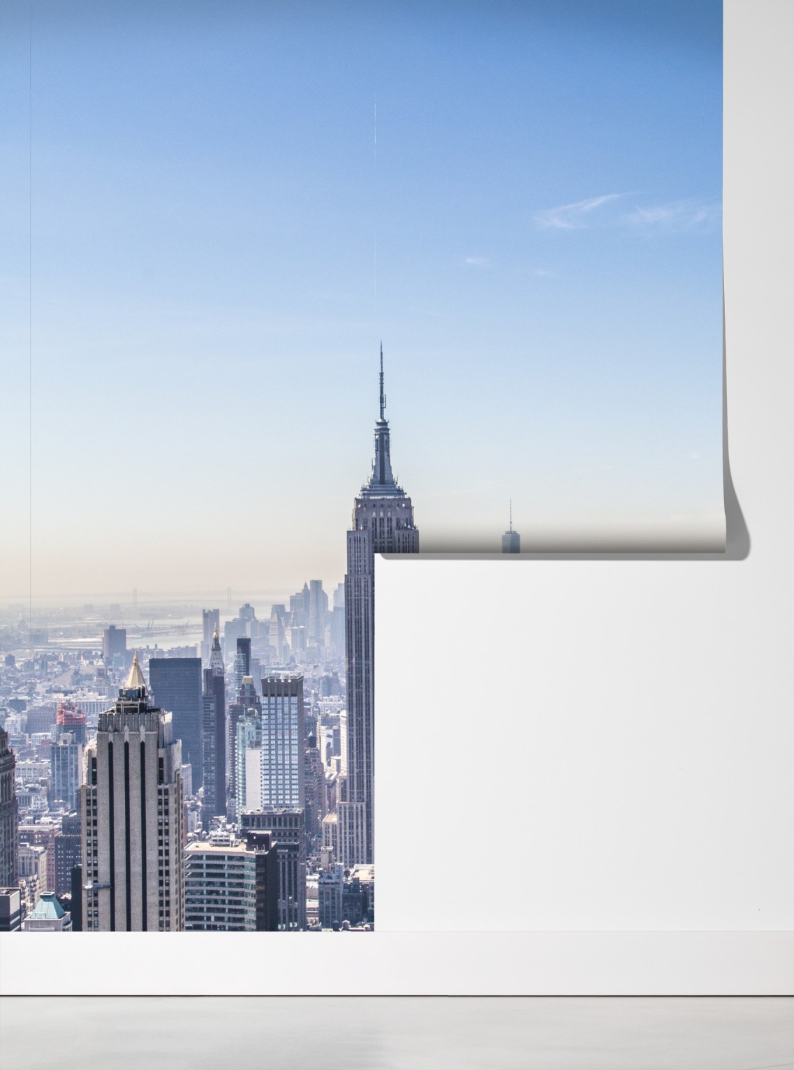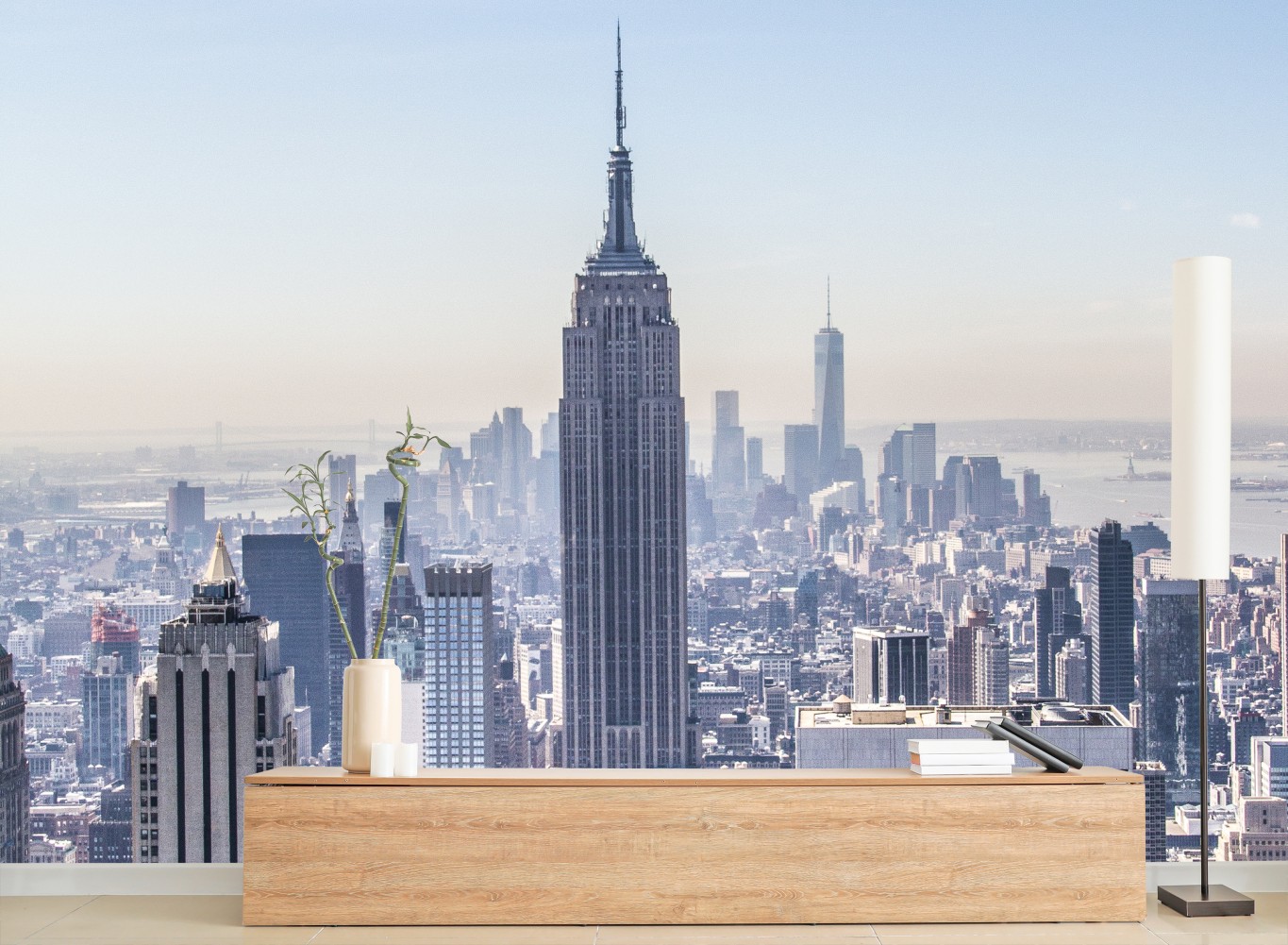 Verwandeln Sie Ihren Raum mit einem klaren Stadtbild von New York und dem Empire State Building vor blauem Himmel, ideal für moderne Einrichtungen.