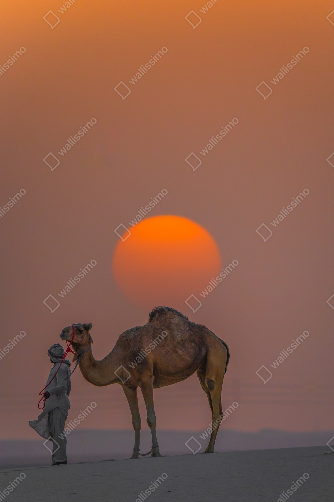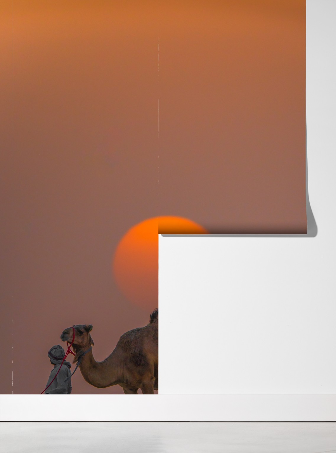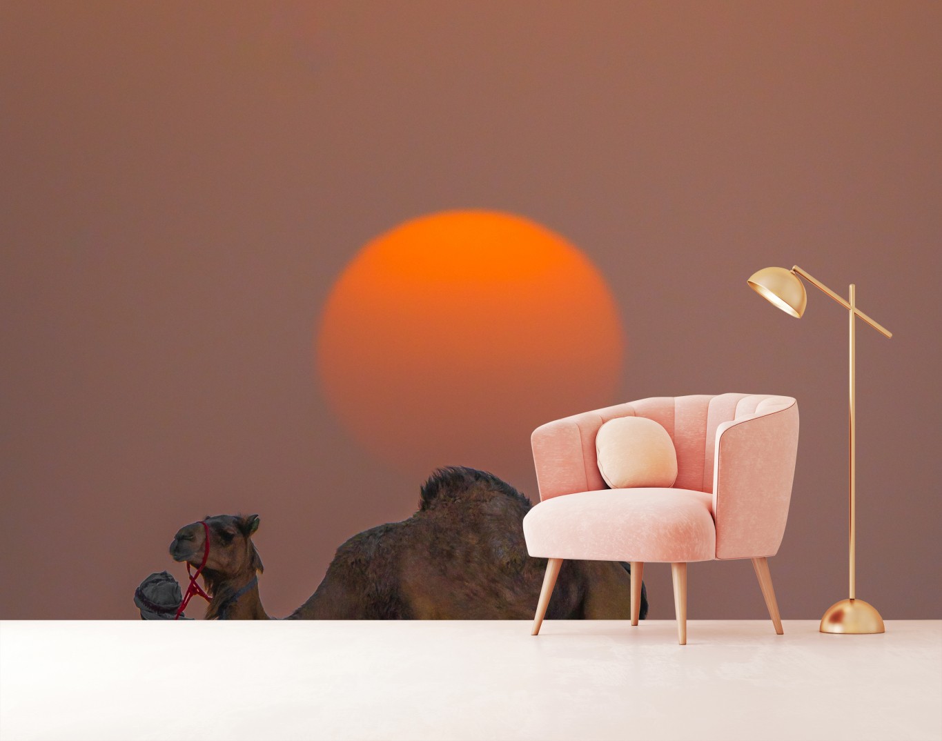 Erleben Sie die ruhige Schönheit eines Wüsten-Sonnenuntergangs mit der majestätischen Silhouette eines Kamels, die Wärme und Fernweh in jeden Raum bringt.
