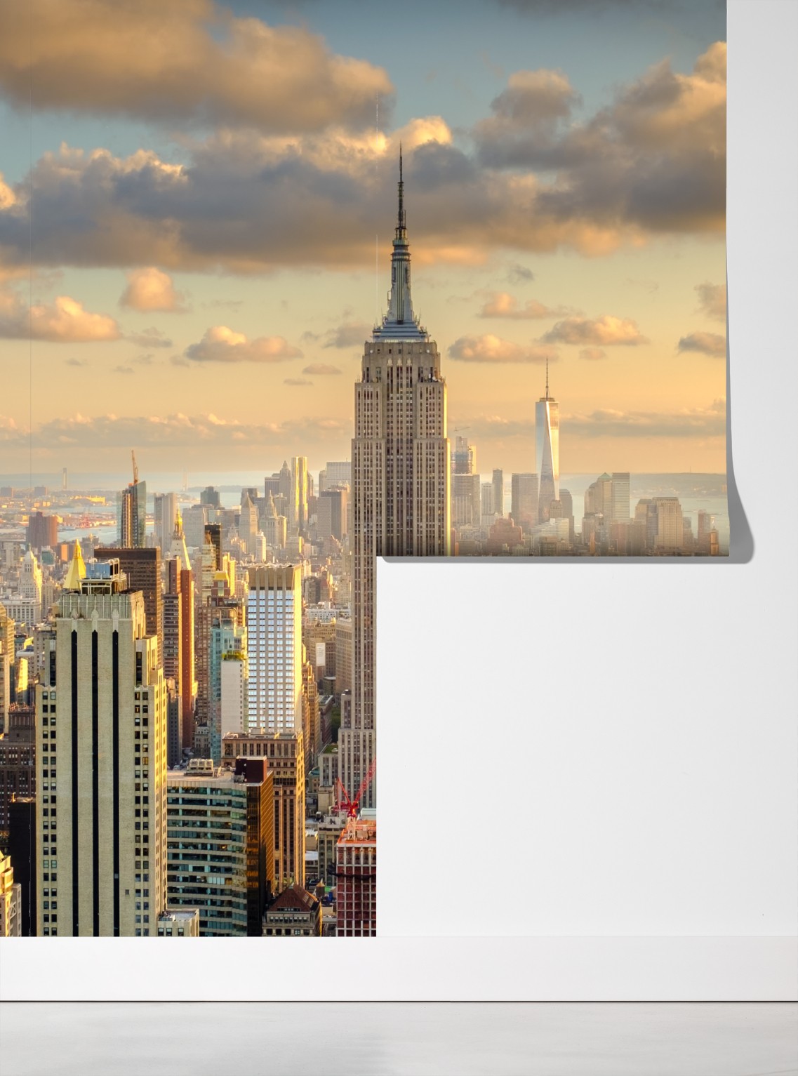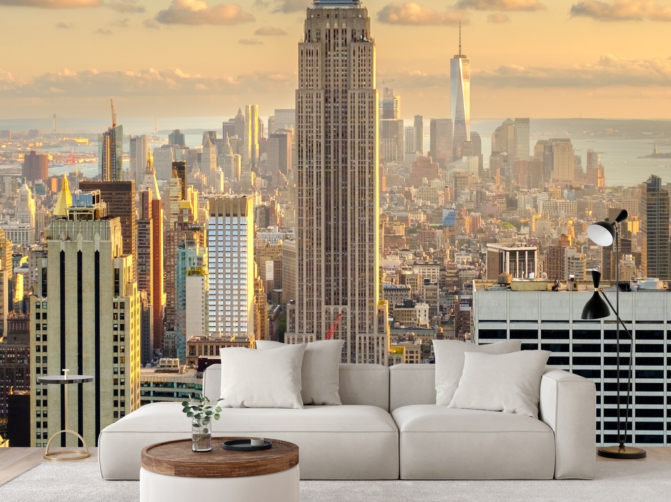 Bringen Sie die ikonische Skyline von New York in Ihr Zuhause mit warmen Sonnenuntergangstönen und beeindruckender urbaner Tiefe.