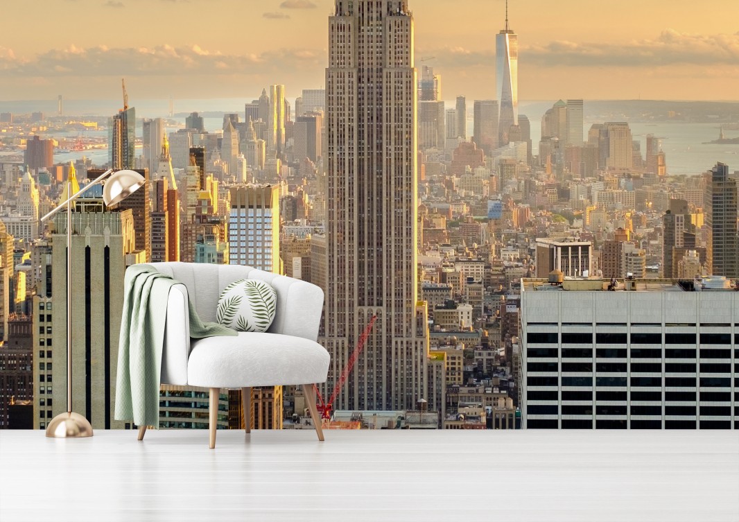 Bringen Sie die ikonische Skyline von New York in Ihr Zuhause mit warmen Sonnenuntergangstönen und beeindruckender urbaner Tiefe.MehrWeniger