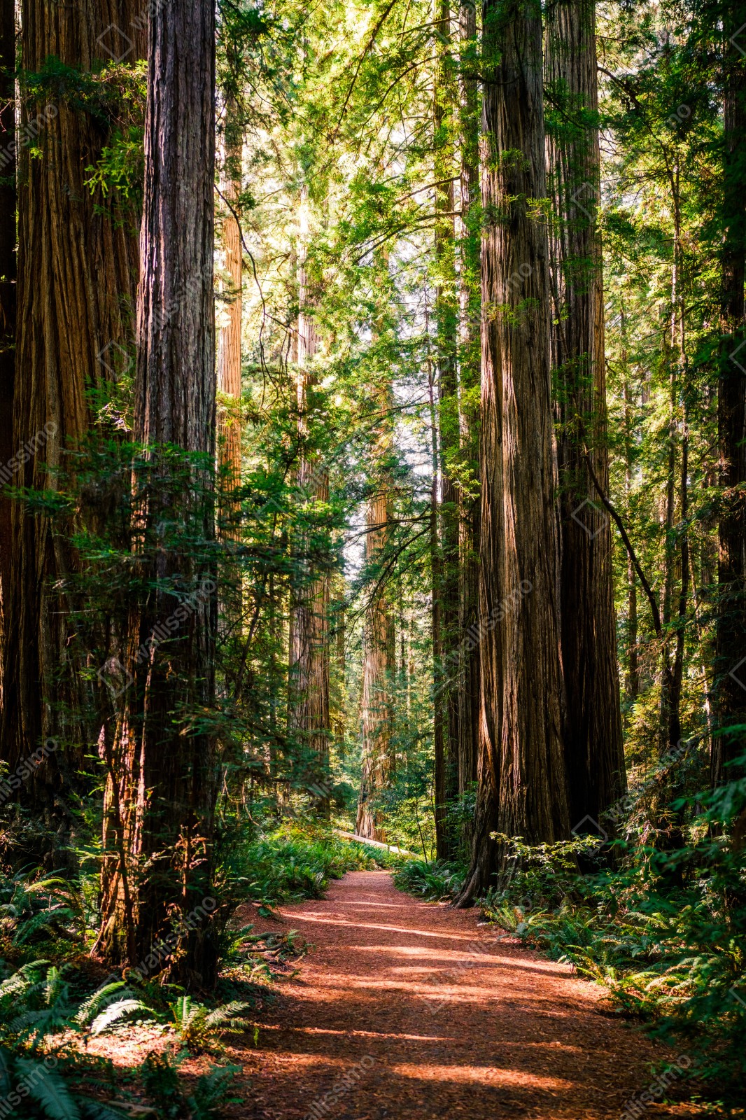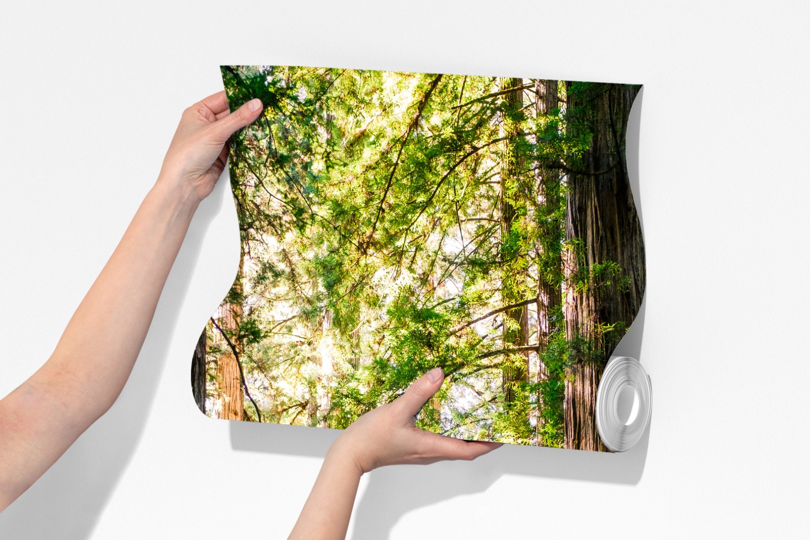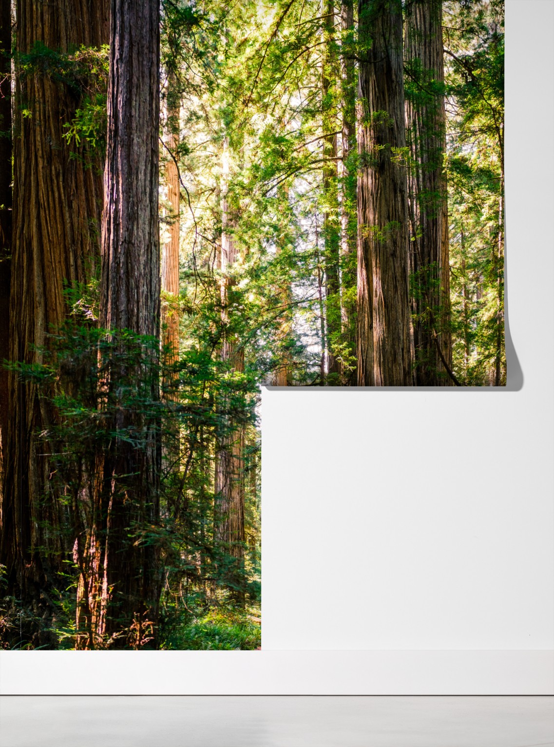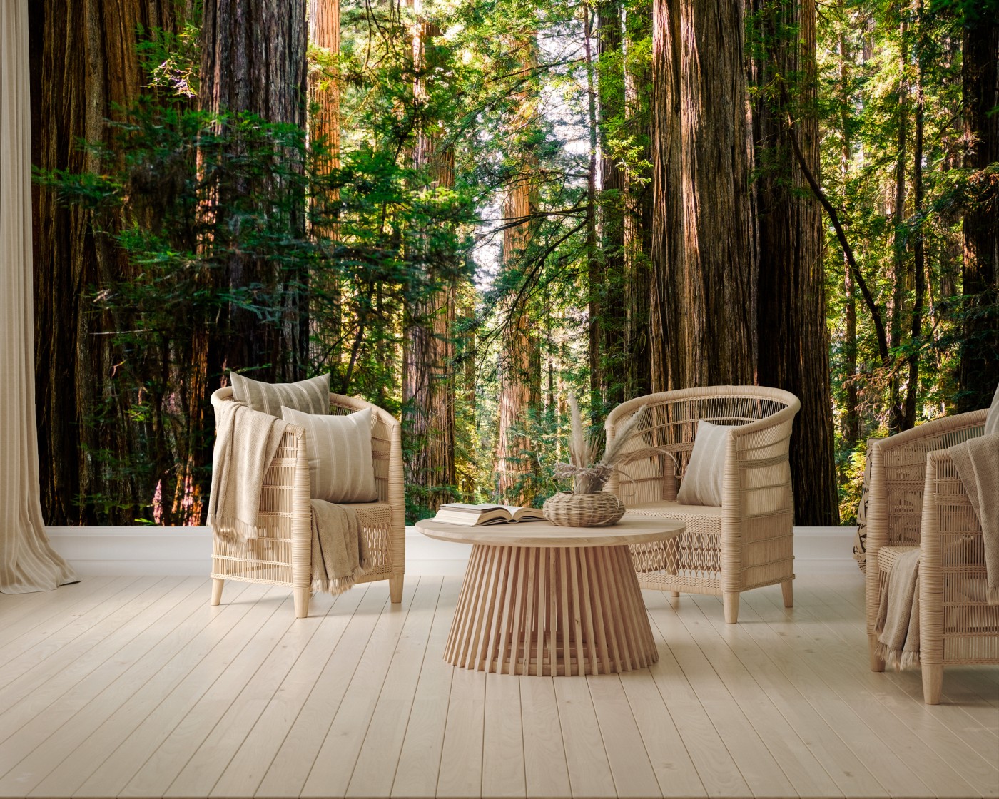 Bringen Sie beruhigende Waldatmosphäre in Ihr Zuhause mit diesem Bild eines sonnendurchfluteten Weges durch den Sekwoienwald, ideal zum Entspannen.
