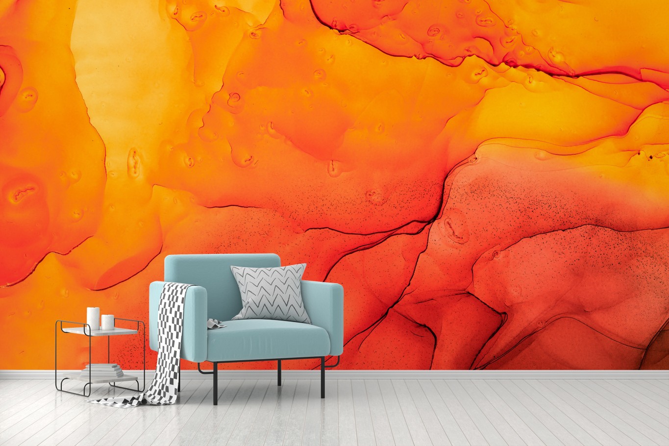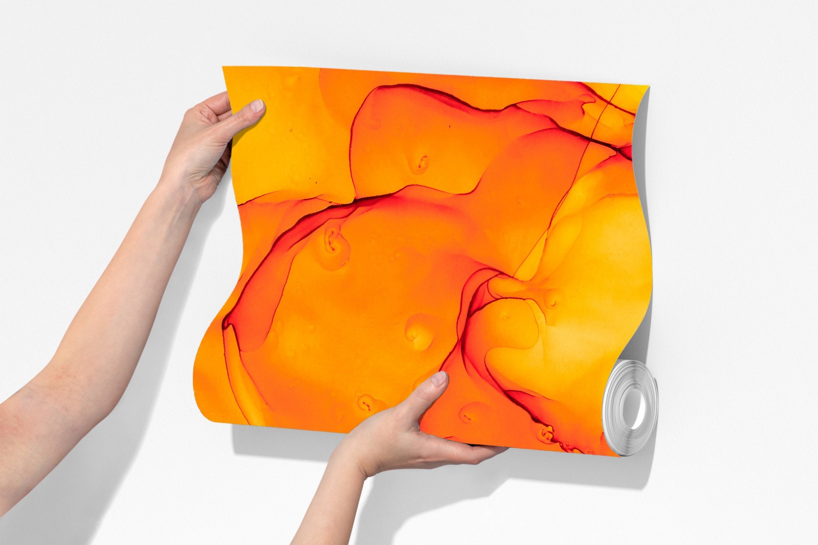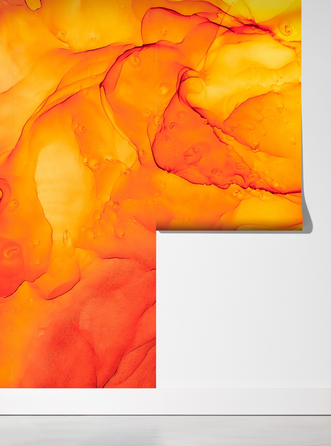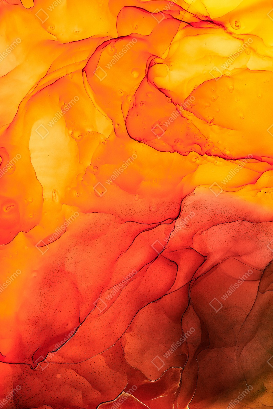 Beleben Sie Ihren Raum mit einer lebendigen abstrakten Komposition aus fließenden Orange- und Gelbtönen, ideal für moderne Interieurs.