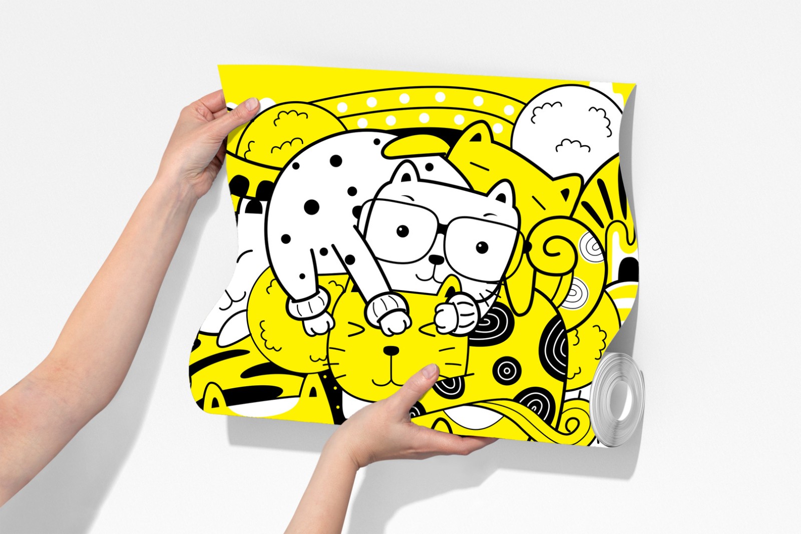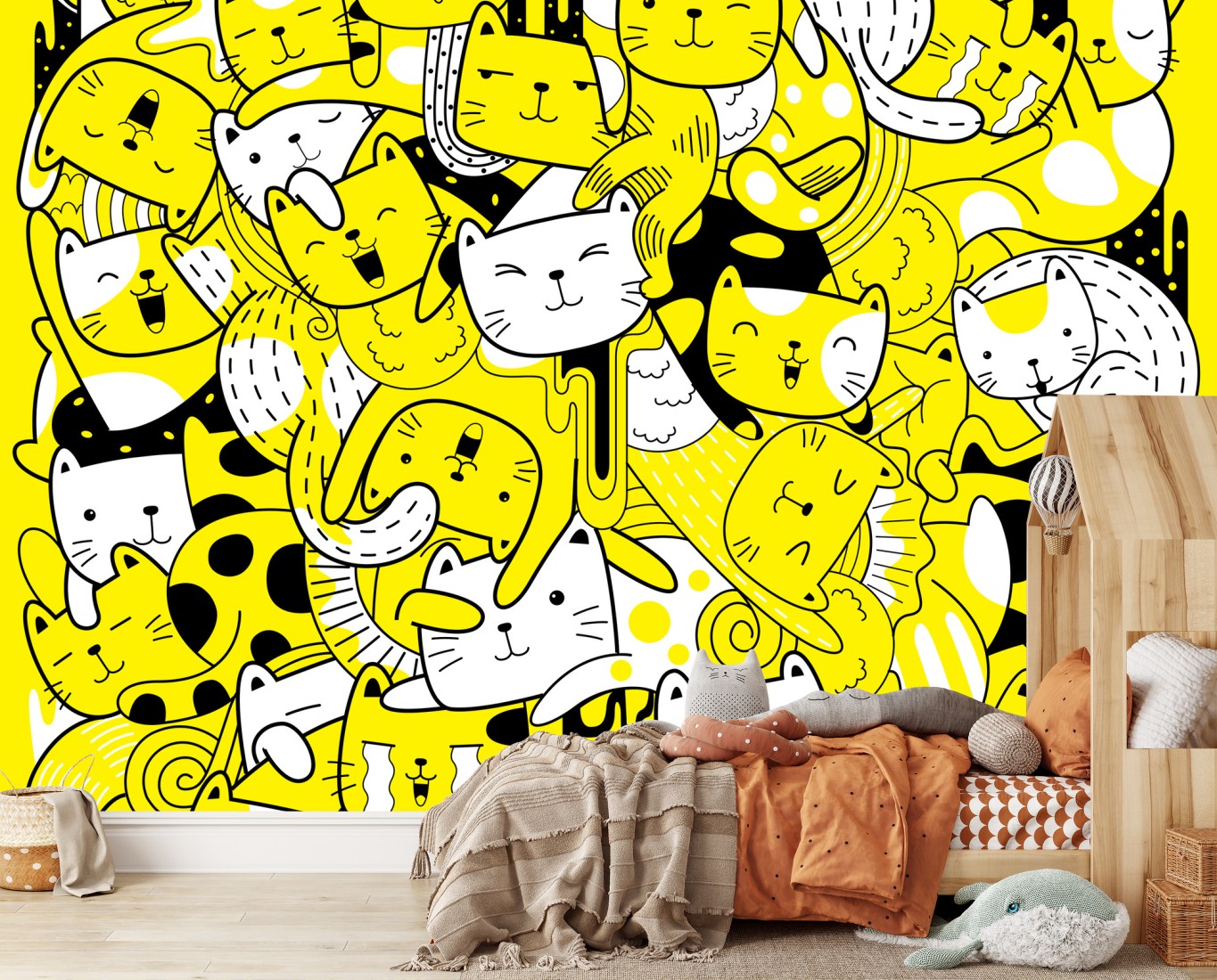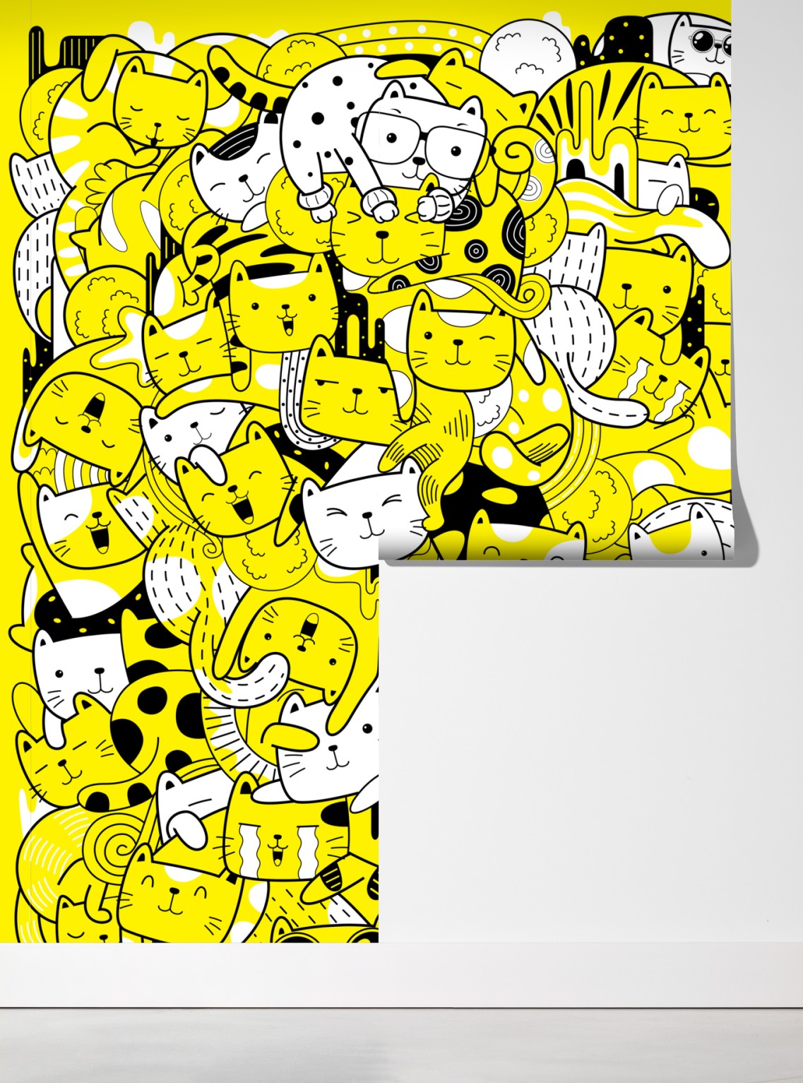 Helle und verspielte Katzen-Collage bringt fröhliche Energie in jeden Raum, ideal für Kinderzimmer oder moderne Interieurs.