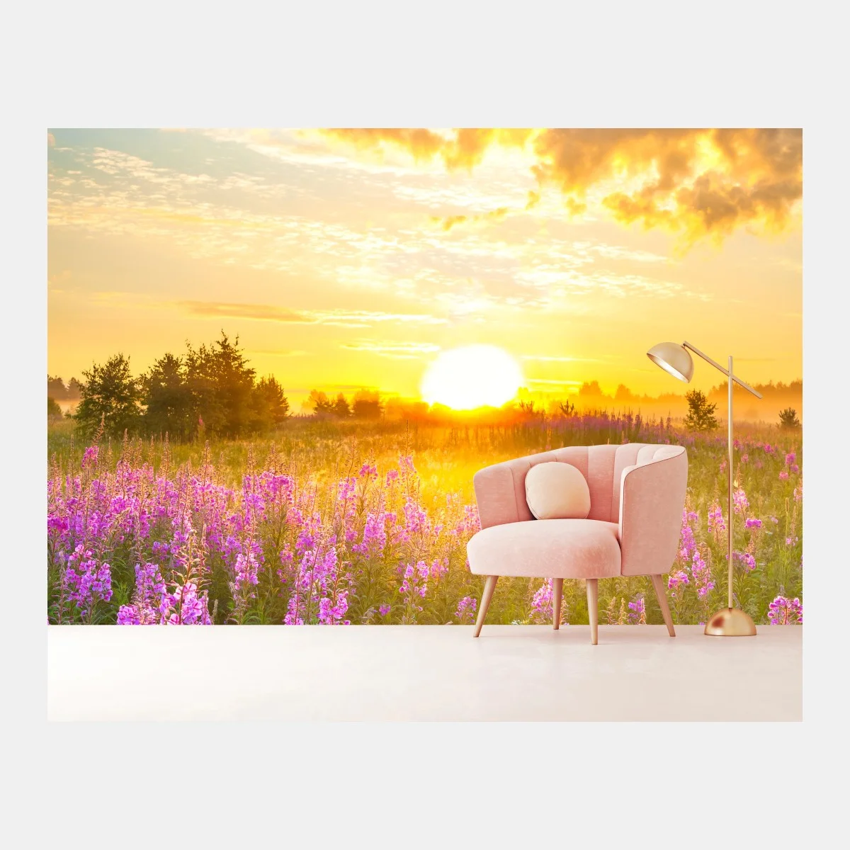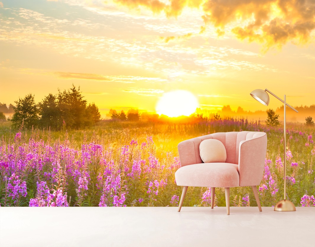 Fototapete Sonnenaufgang über violetter wildblumenwiese