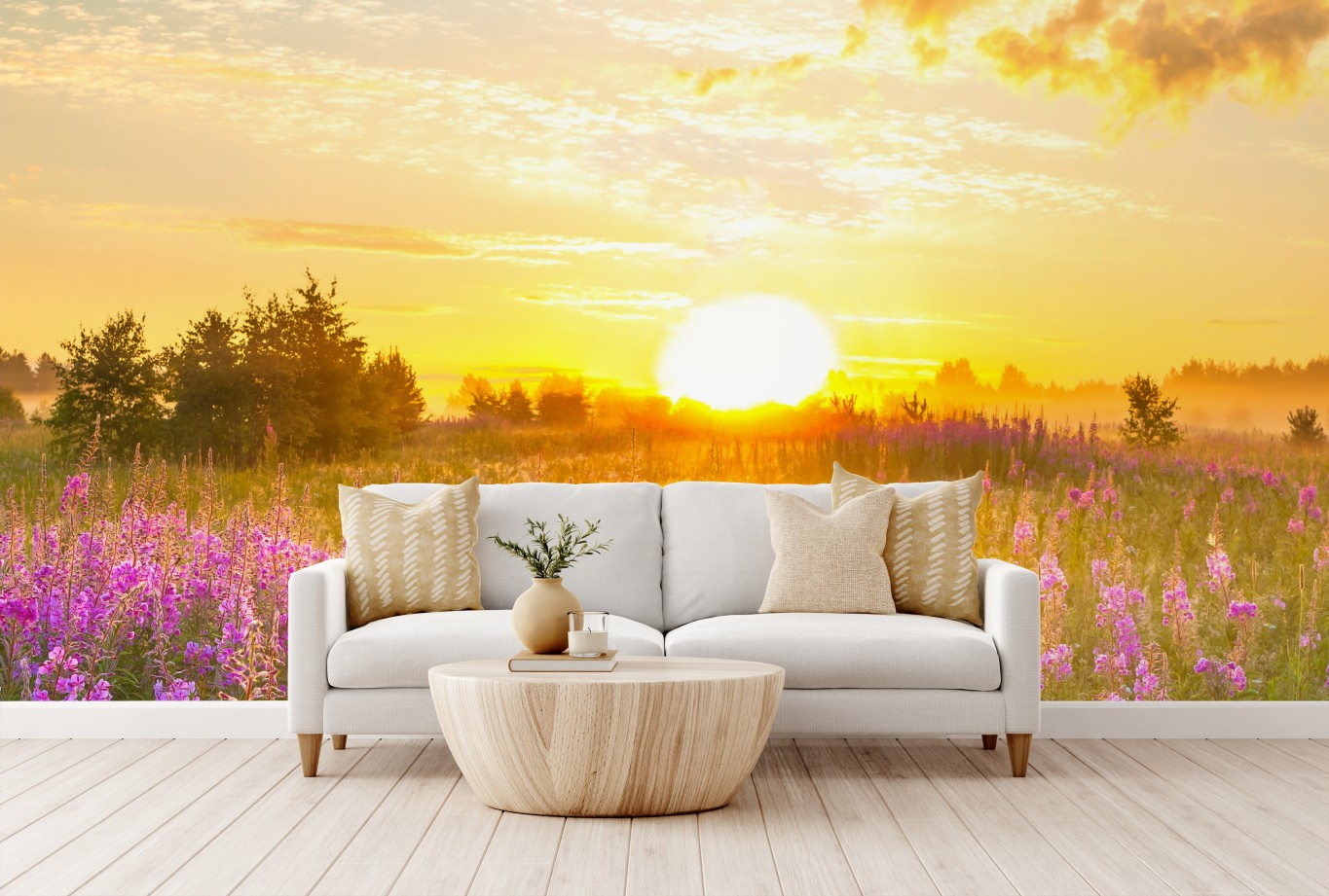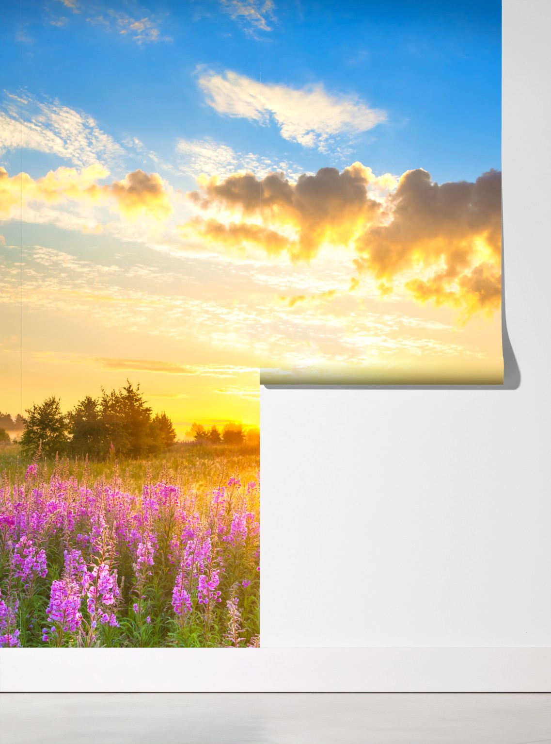Fototapete sonnenaufgang über violetter wildblumenwiese
