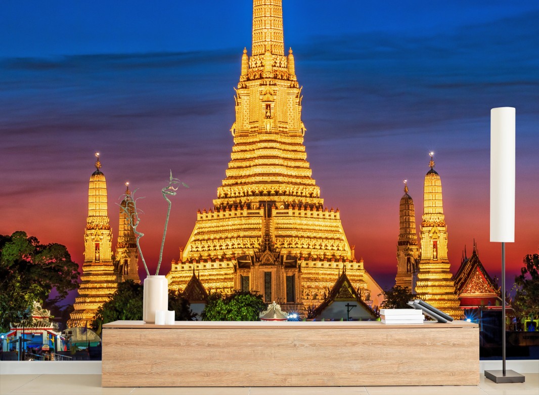 Erleben Sie das goldene Wat Arun in der Dämmerung, ein beeindruckendes historisches Bauwerk, das jedem Raum warme, reiseinspirierte Atmosphäre verleiht.MehrWeniger