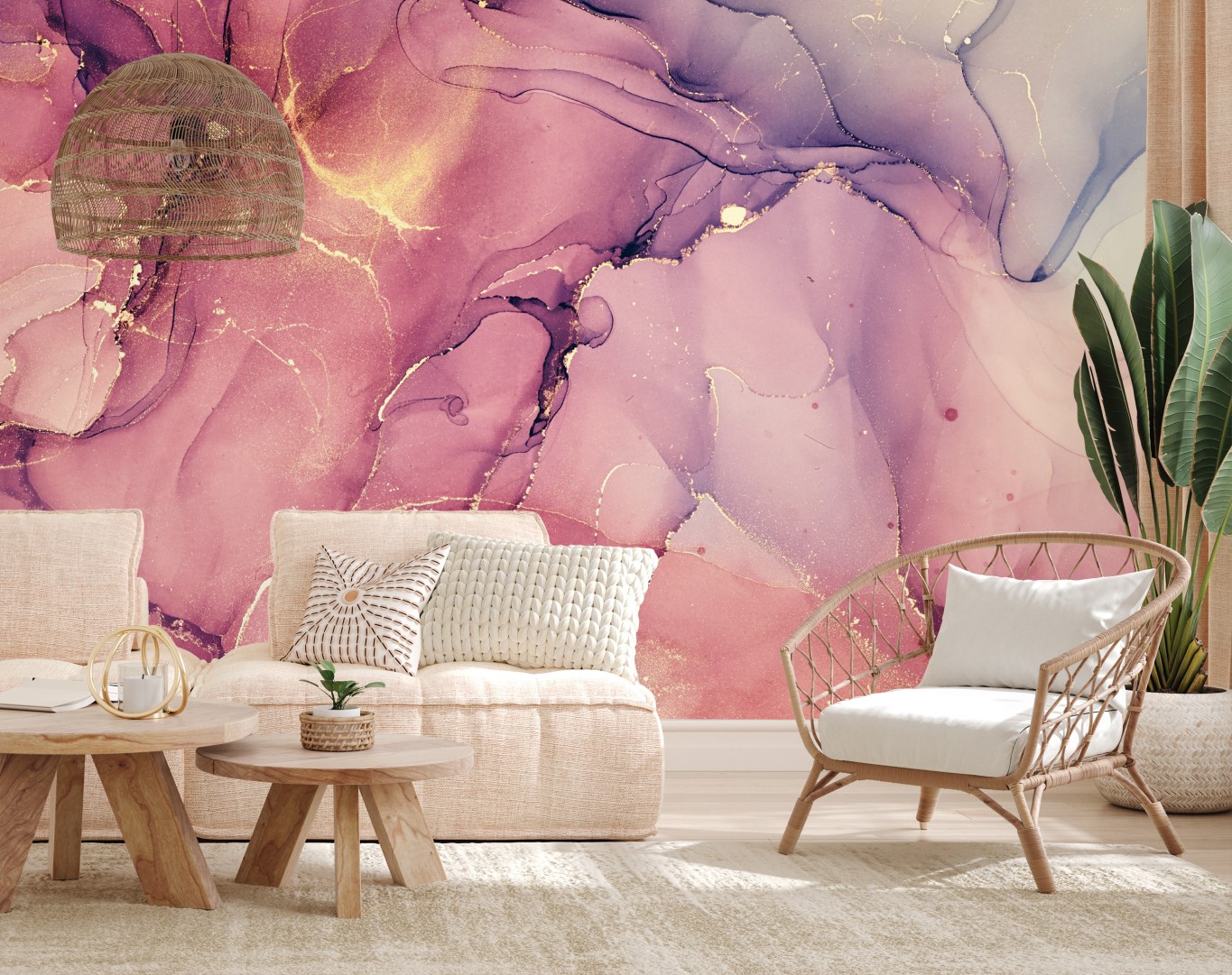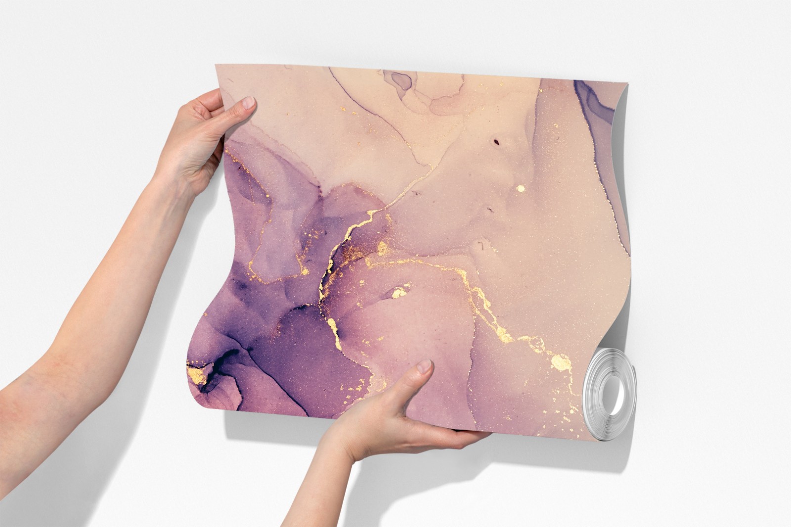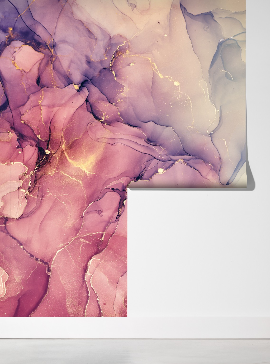 Bringen Sie beruhigende Eleganz an Ihre Wände mit dieser ätherischen lila-rosa Marmorabstraktion mit zarten goldenen Akzenten.