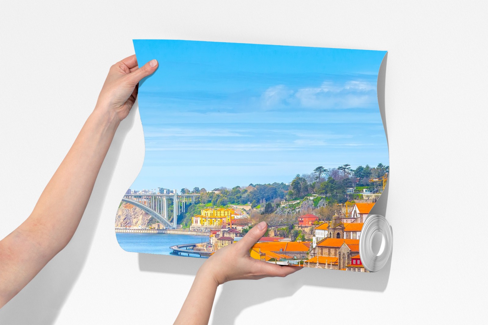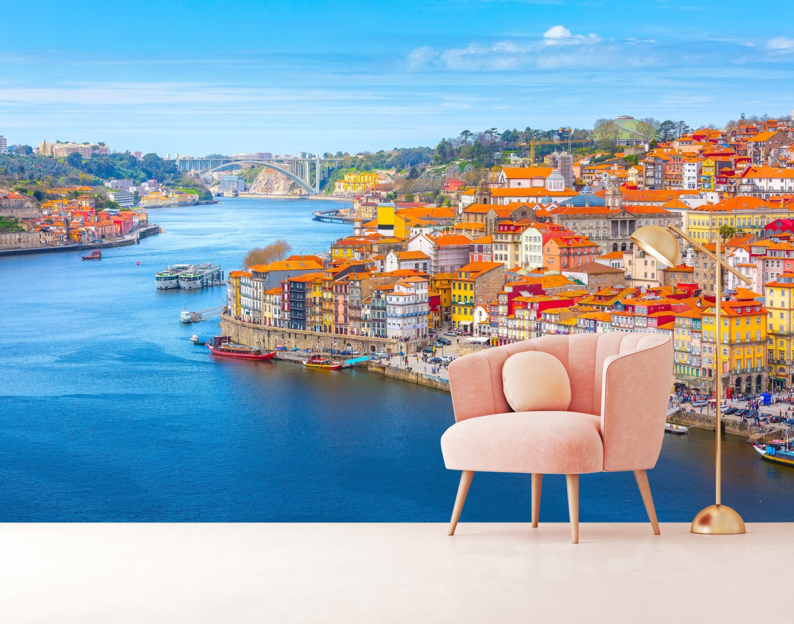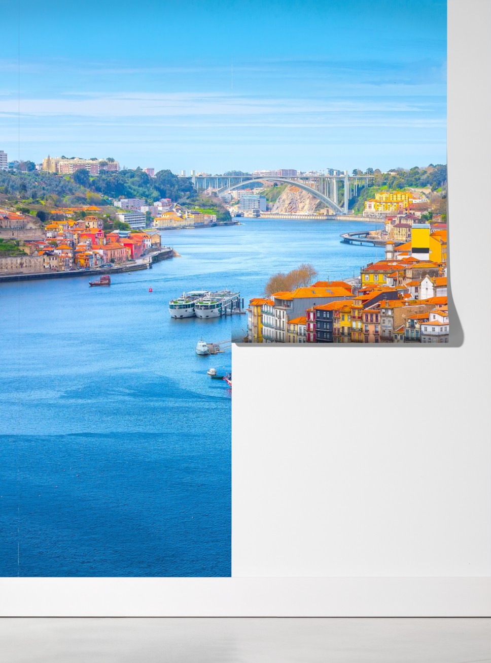 Lebendige Panoramaansicht des Ufers von Porto am Douro mit bunten Häusern und Booten, ideal um Reiseflair und lebendige Farbe in Ihr Zuhause zu bringen.