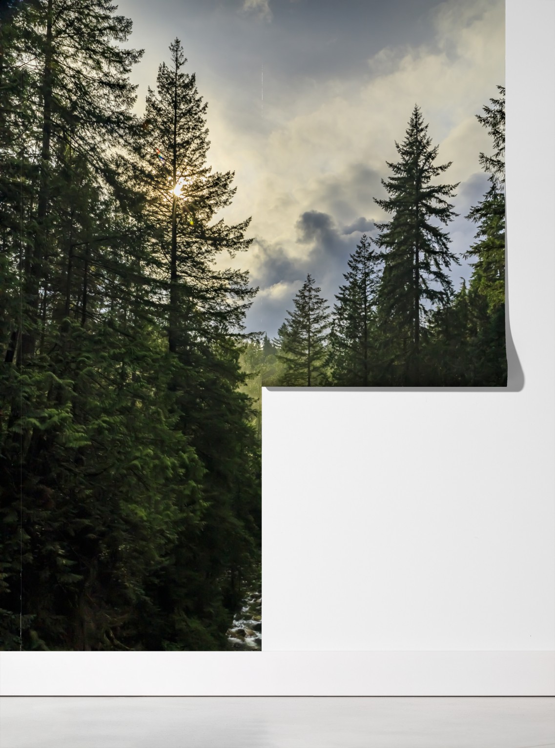 Bringen Sie die beruhigende Atmosphäre eines nebligen immergrünen Waldes in Ihr Zuhause mit diesem vertikalen Naturmotiv, das einen versteckten Wasserfall und Sonnenstrahlen zeigt.