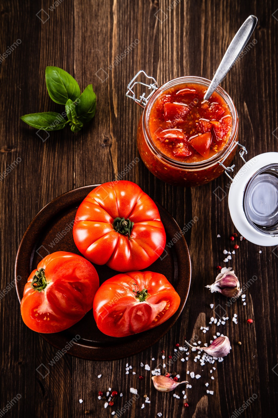 Bringen Sie rustikalen Charme in die Küche mit reifen Tomaten und hausgemachter Sauce auf warmem Holzhintergrund.