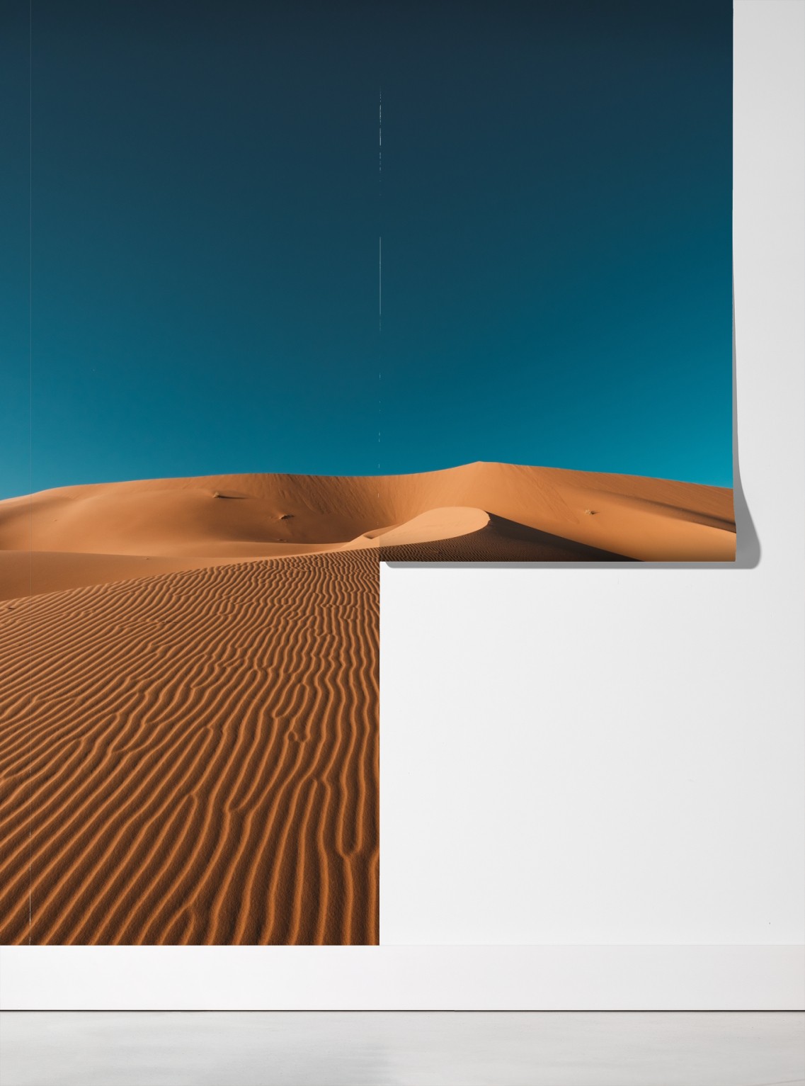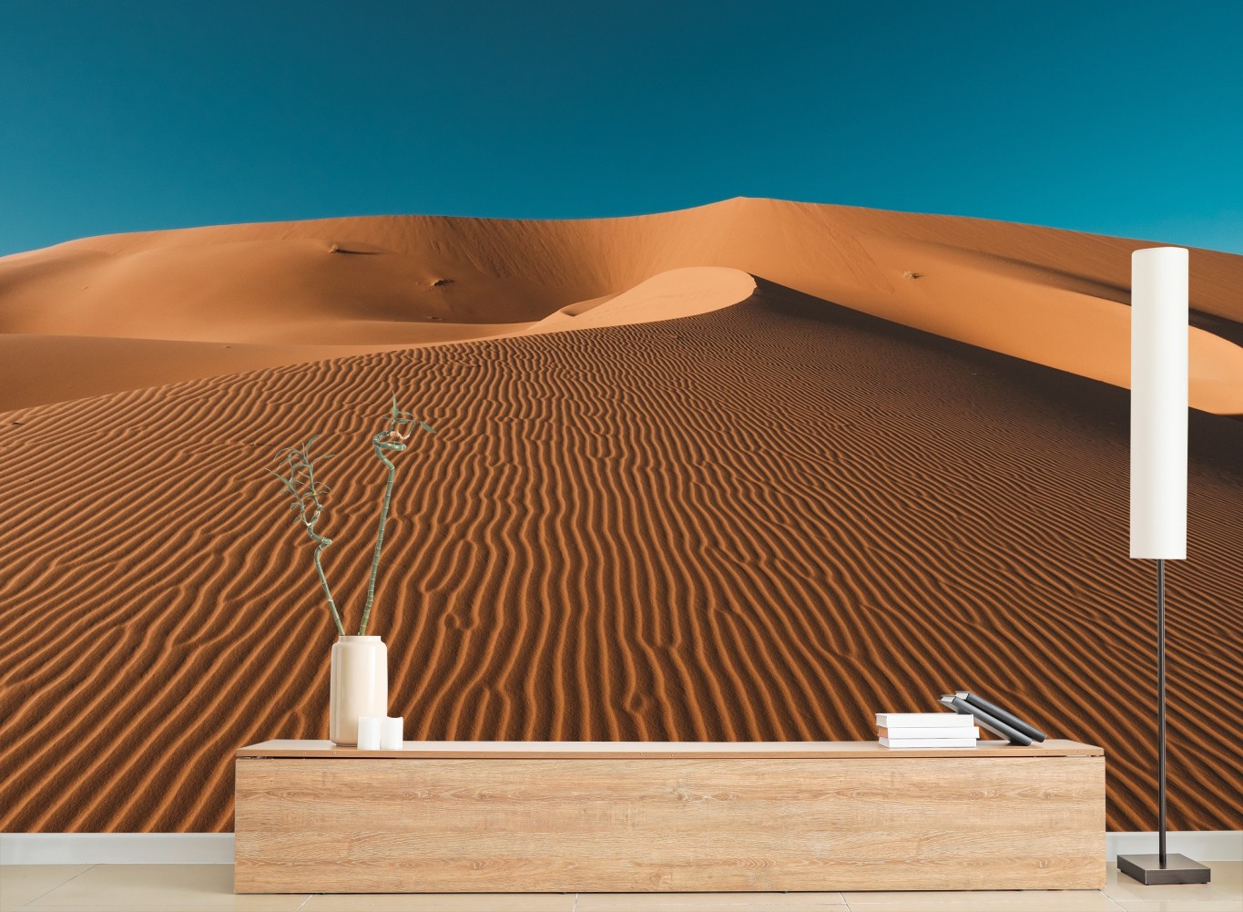 Bringen Sie ruhige Wüstenästhetik in Ihr Zuhause mit diesem Bild von windgeformten Sanddünen vor einem intensiven blauen Himmel.