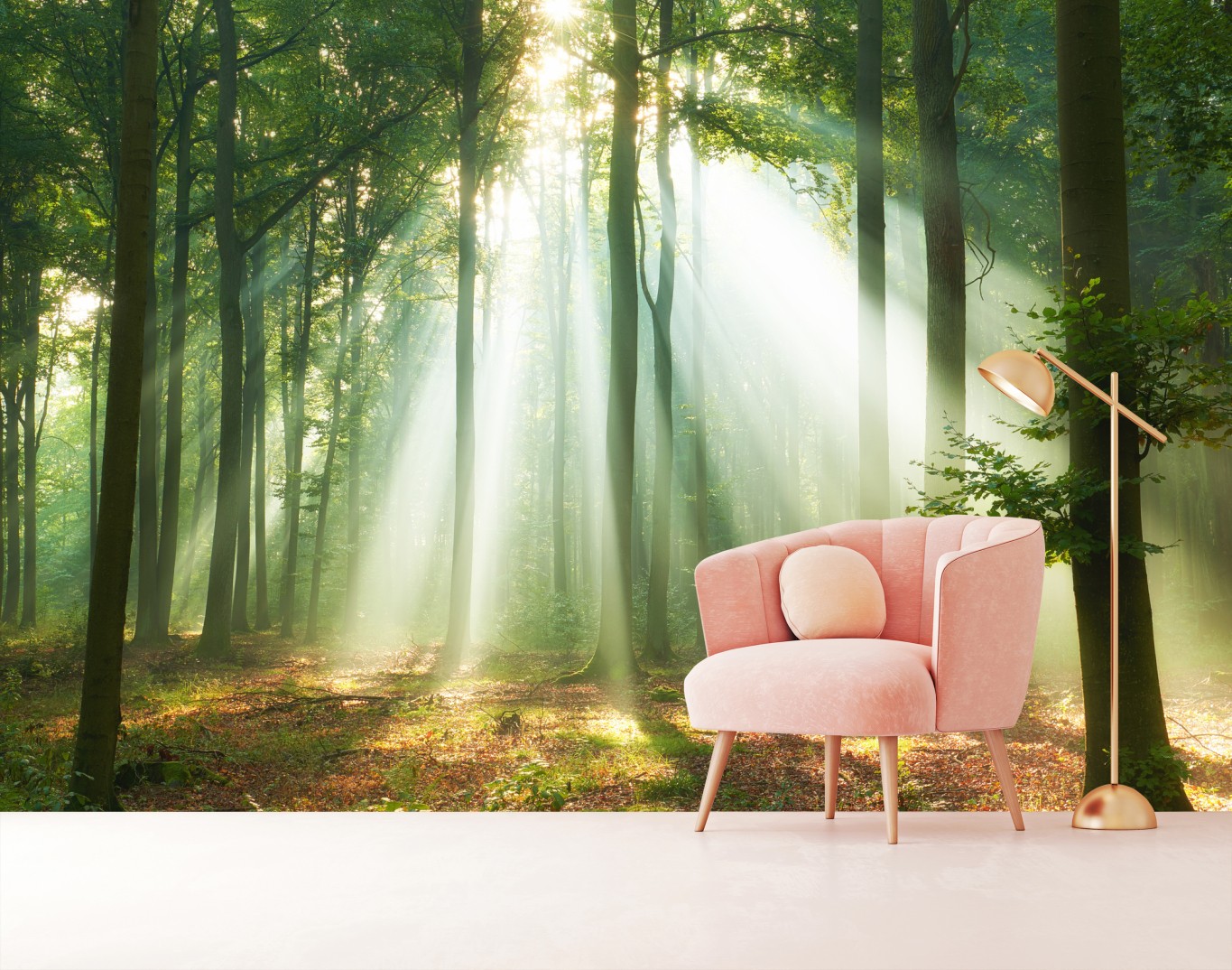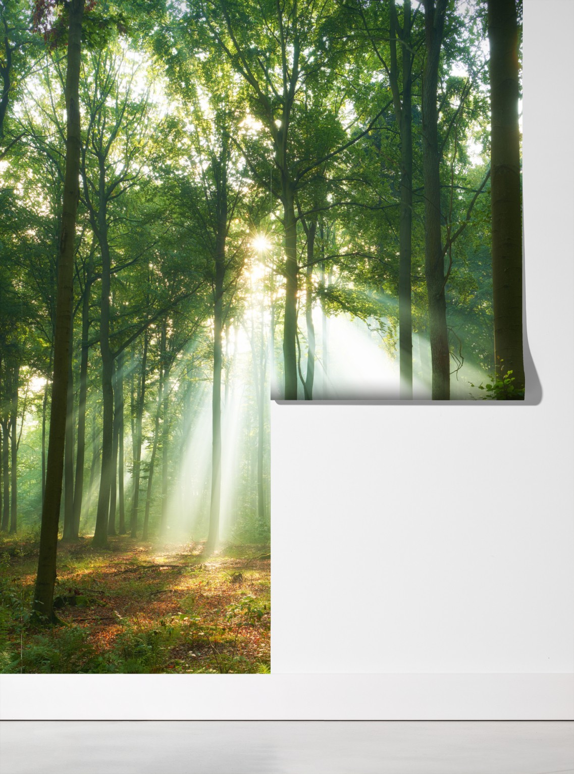 Erleben Sie die Ruhe des Waldes am Morgen, wenn Sonnenstrahlen durch die Bäume fallen und den Raum mit natürlichem Licht füllen.