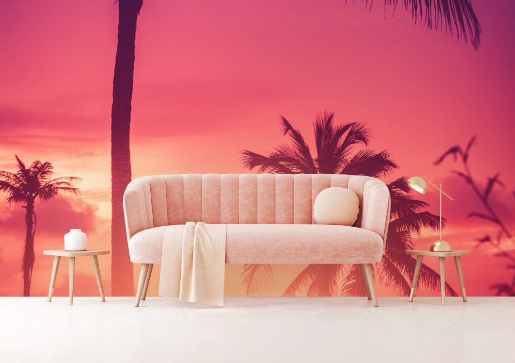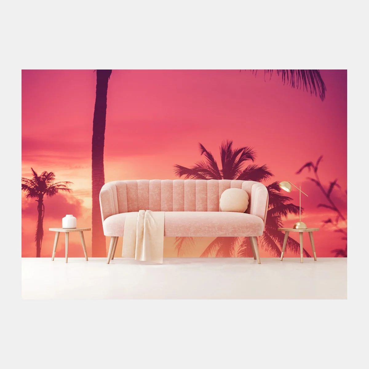 Erleben Sie einen warmen tropischen Sonnenuntergang mit dramatischen Palmensilhouetten und lebhaften rosa-orangefarbenen Himmeln, der eine entspannte Urlaubsstimmung in Ihr Zuhause bringt.MehrWeniger