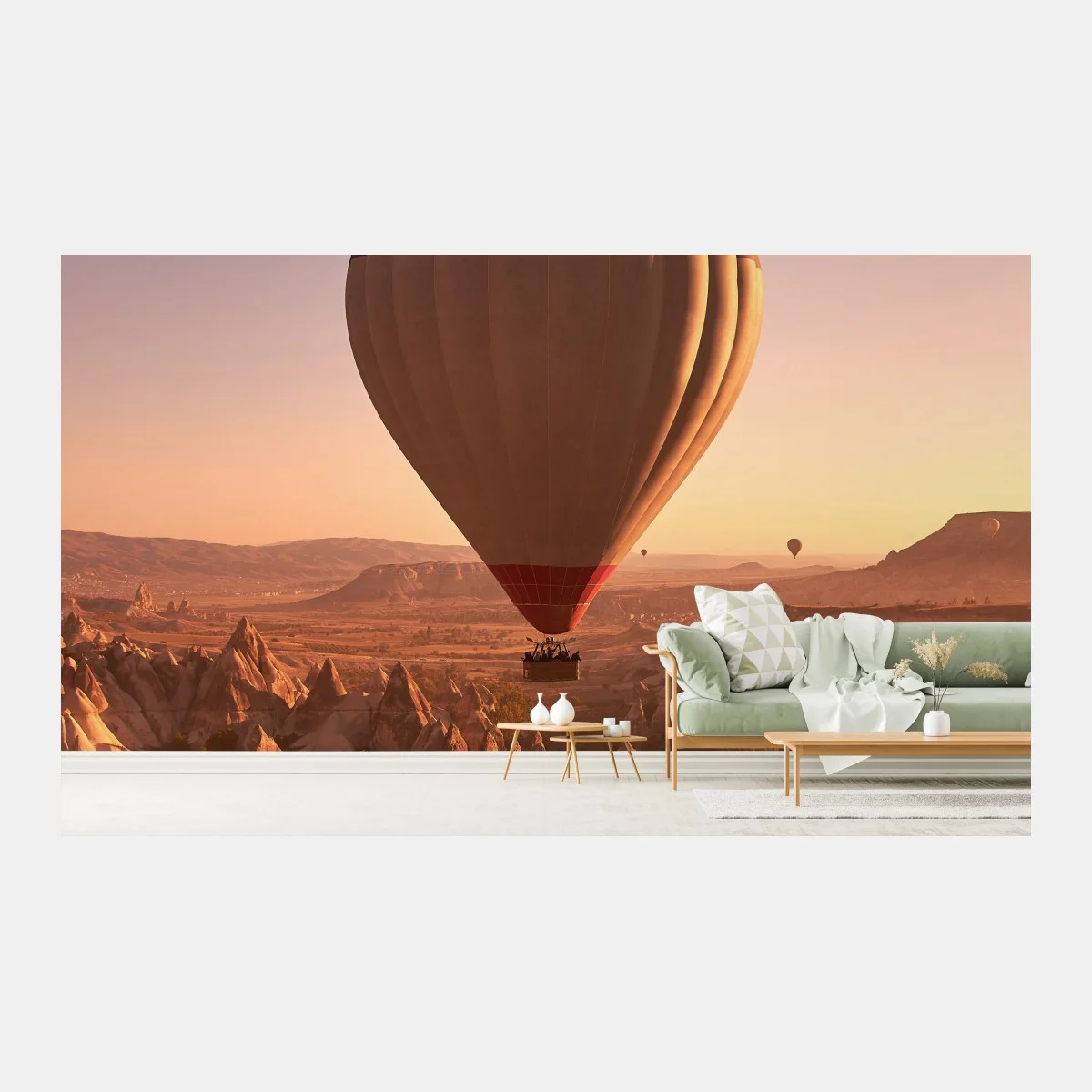 Erleben Sie die stille Schönheit Kappadokiens bei Sonnenaufgang mit einem schwebenden Heißluftballon über markanten Felsformationen, perfekt um jedem Raum Wärme und Fernweh zu verleihen.MehrWeniger