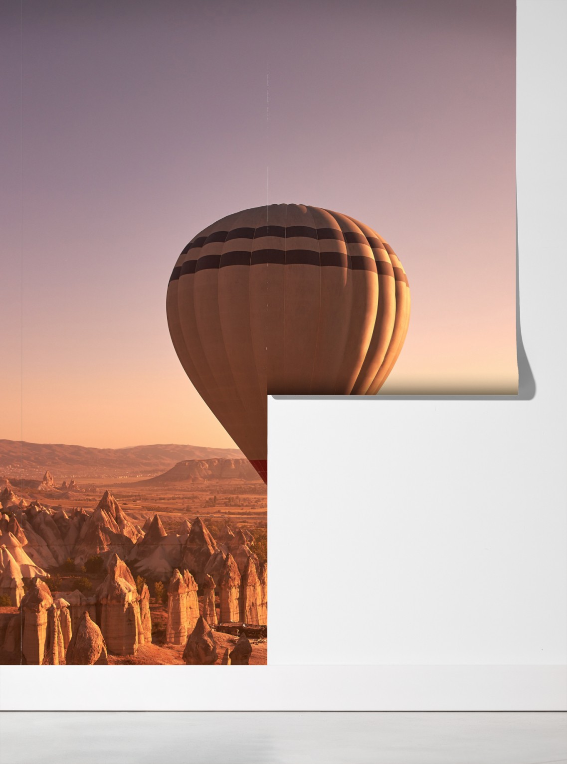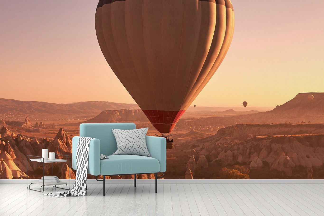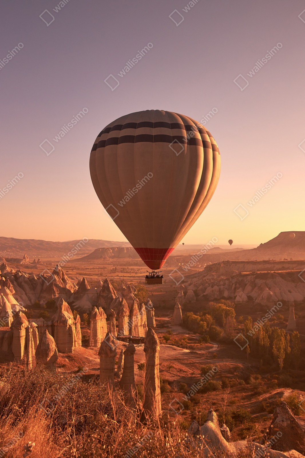 Erleben Sie die stille Schönheit Kappadokiens bei Sonnenaufgang mit einem schwebenden Heißluftballon über markanten Felsformationen, perfekt um jedem Raum Wärme und Fernweh zu verleihen.