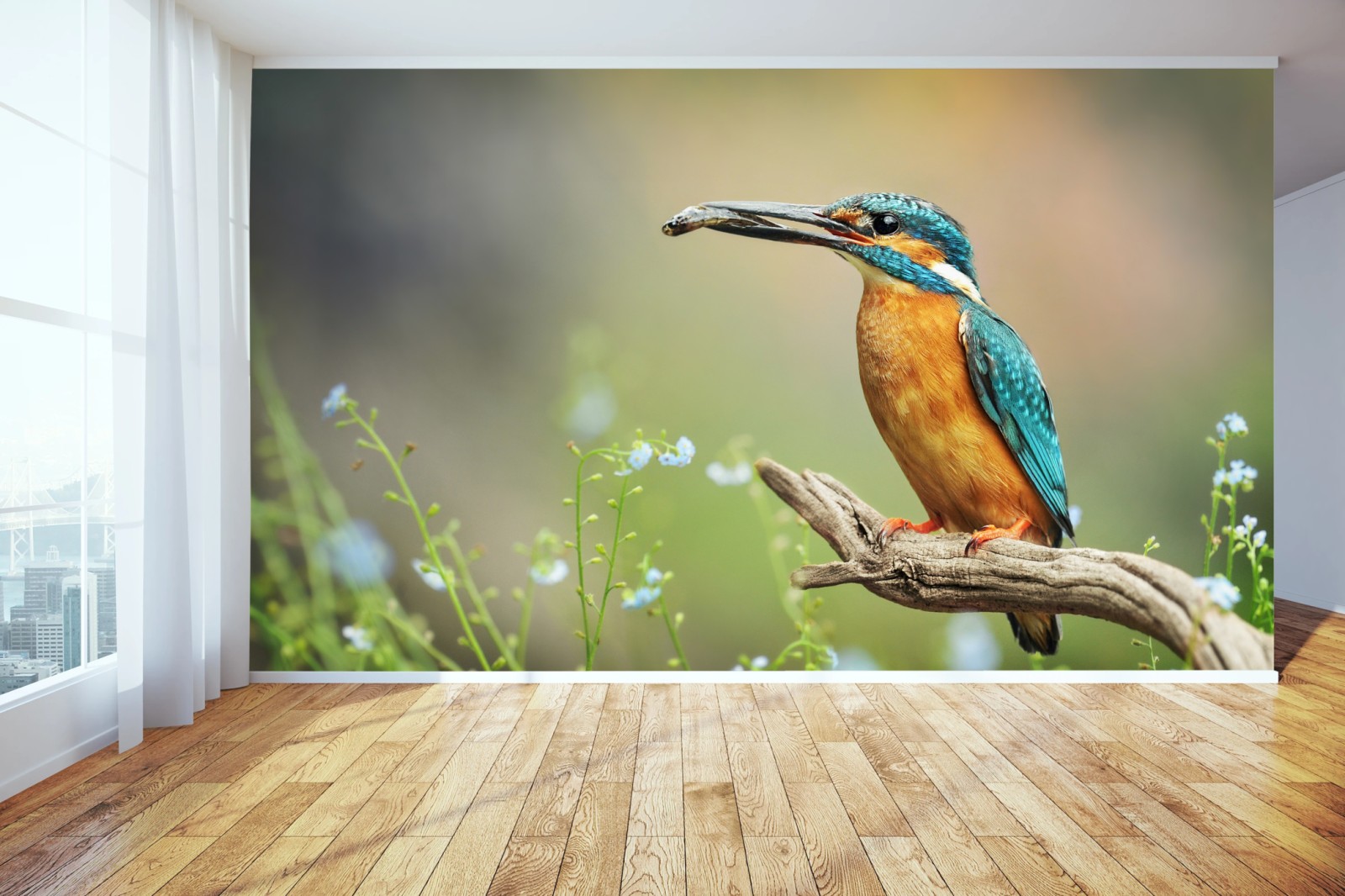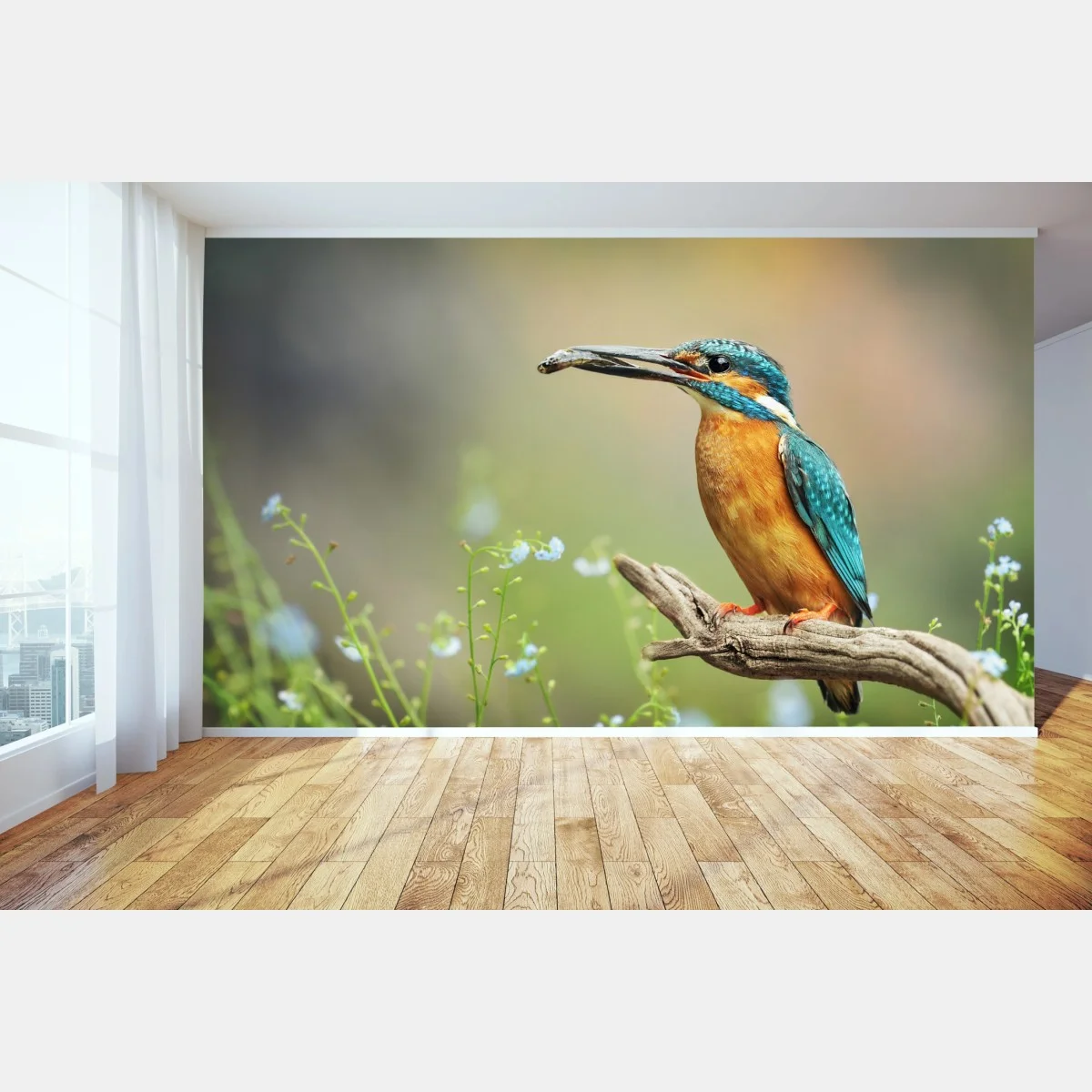 Fototapete Eisvogel auf einem ast mit fisch