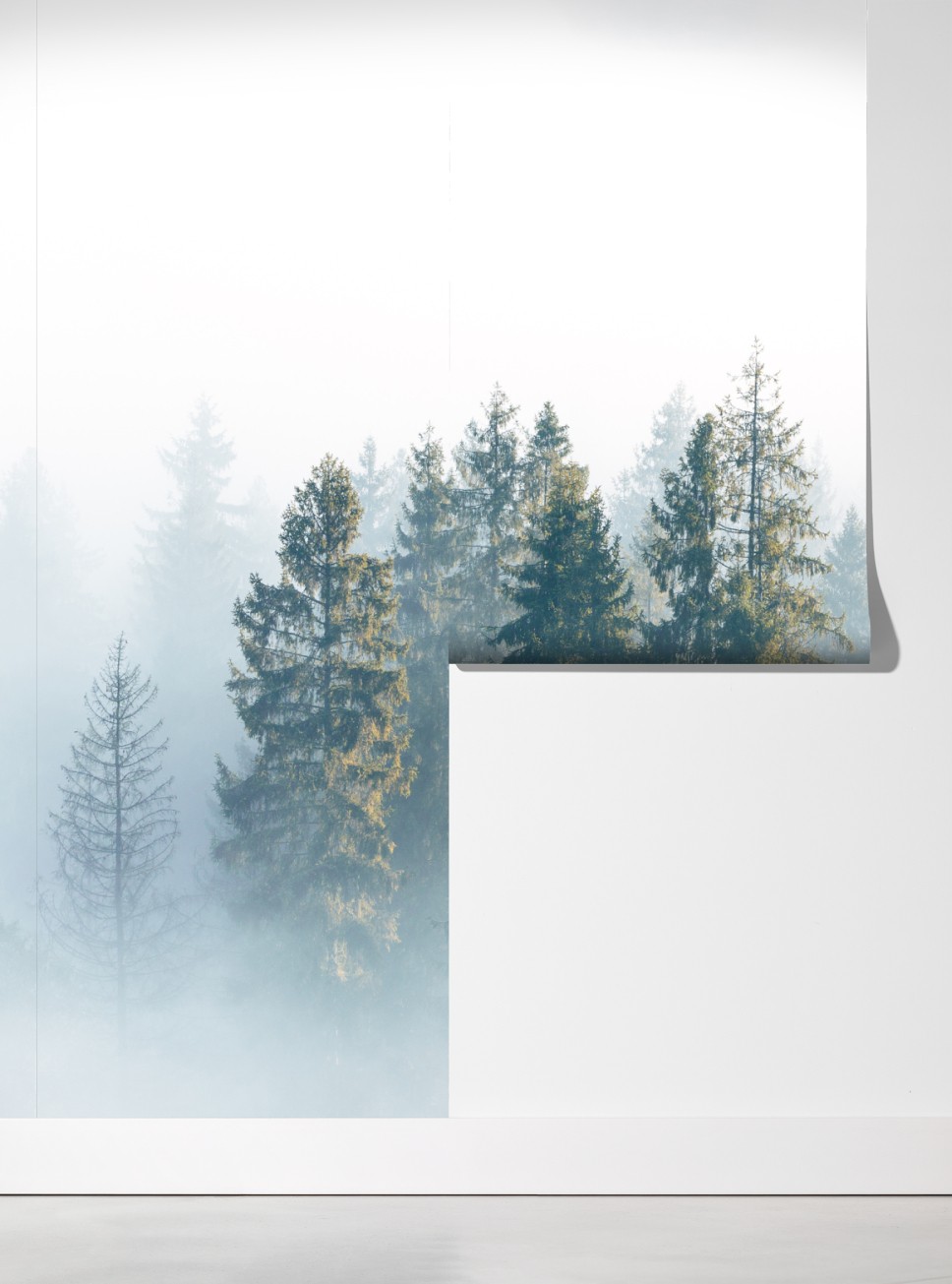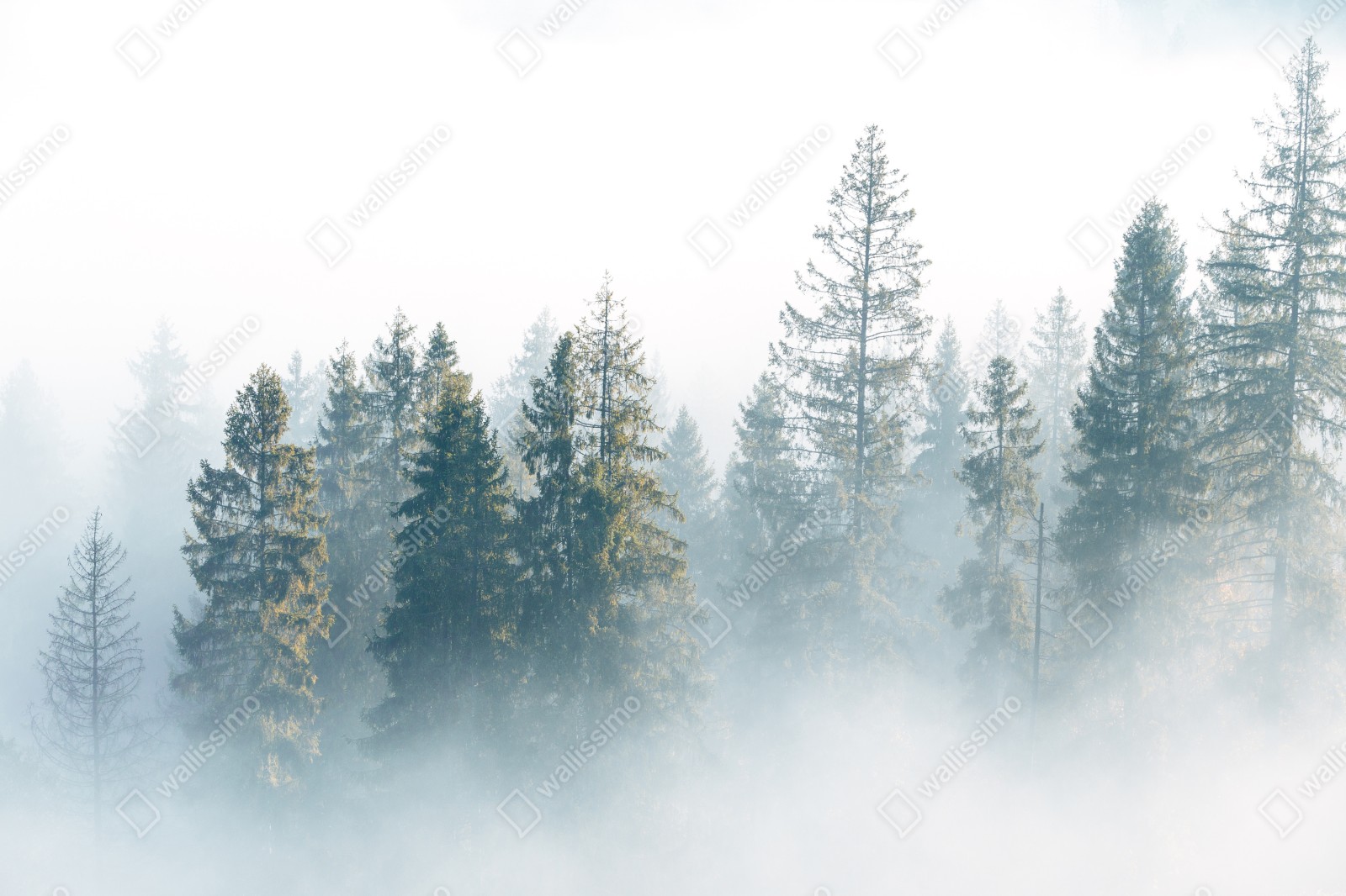 Bringen Sie Ruhe in Ihren Raum mit einer nebligen Fichtenwaldszene, die sanftes Licht und natürliche Atmosphäre ausstrahlt.