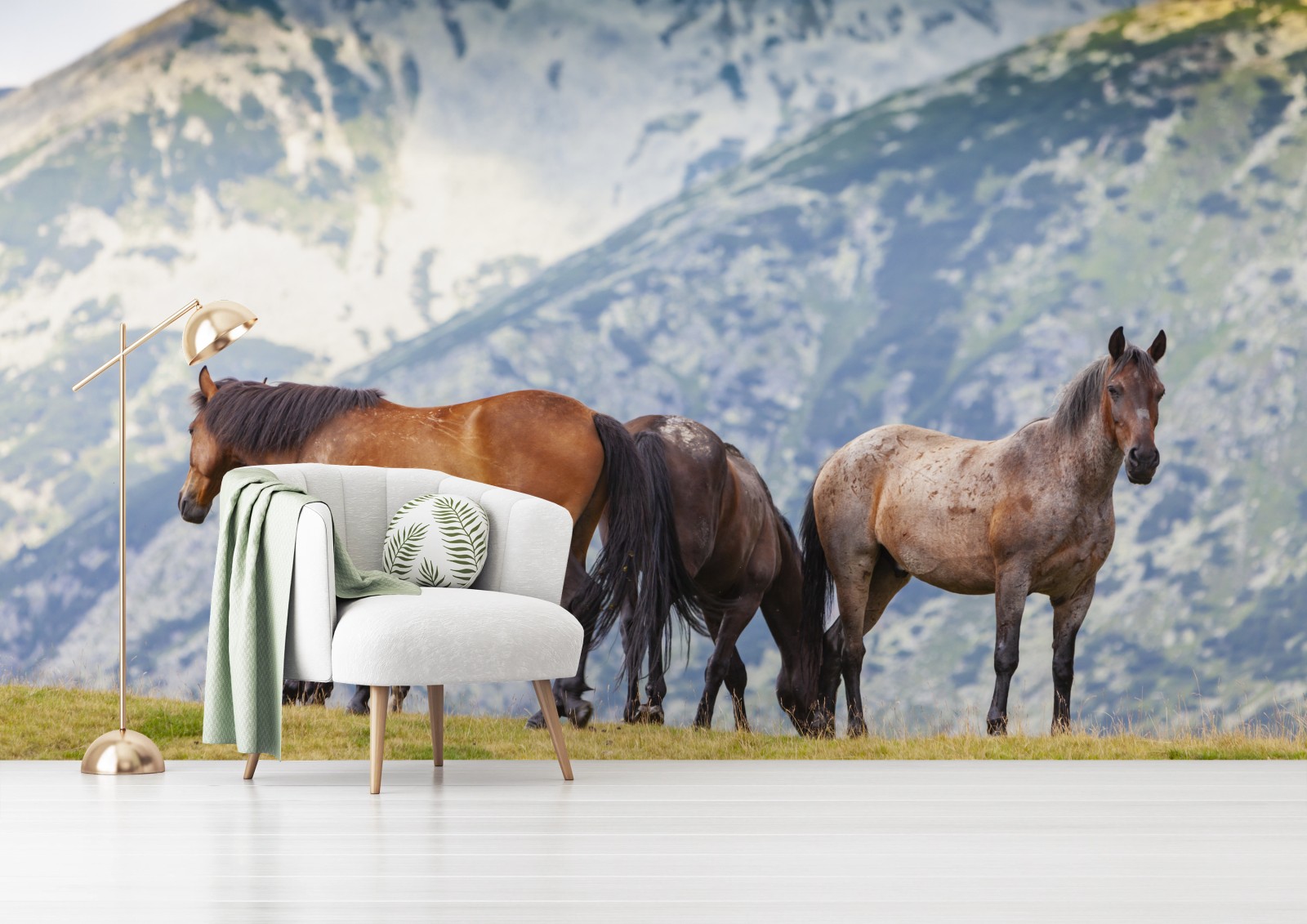 Ruhiger Blick auf grasende Pferde auf einer Bergwiese, der rustikalen Charme und natürliche Ruhe in Ihr Zuhause bringt.MehrWeniger