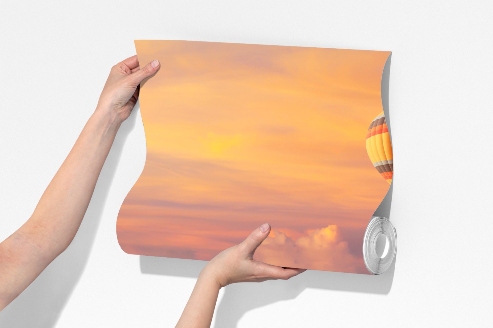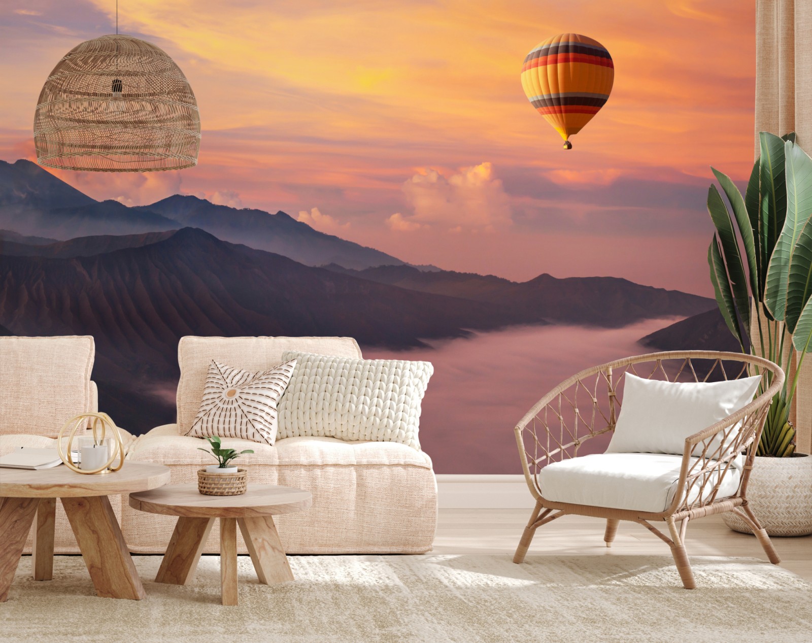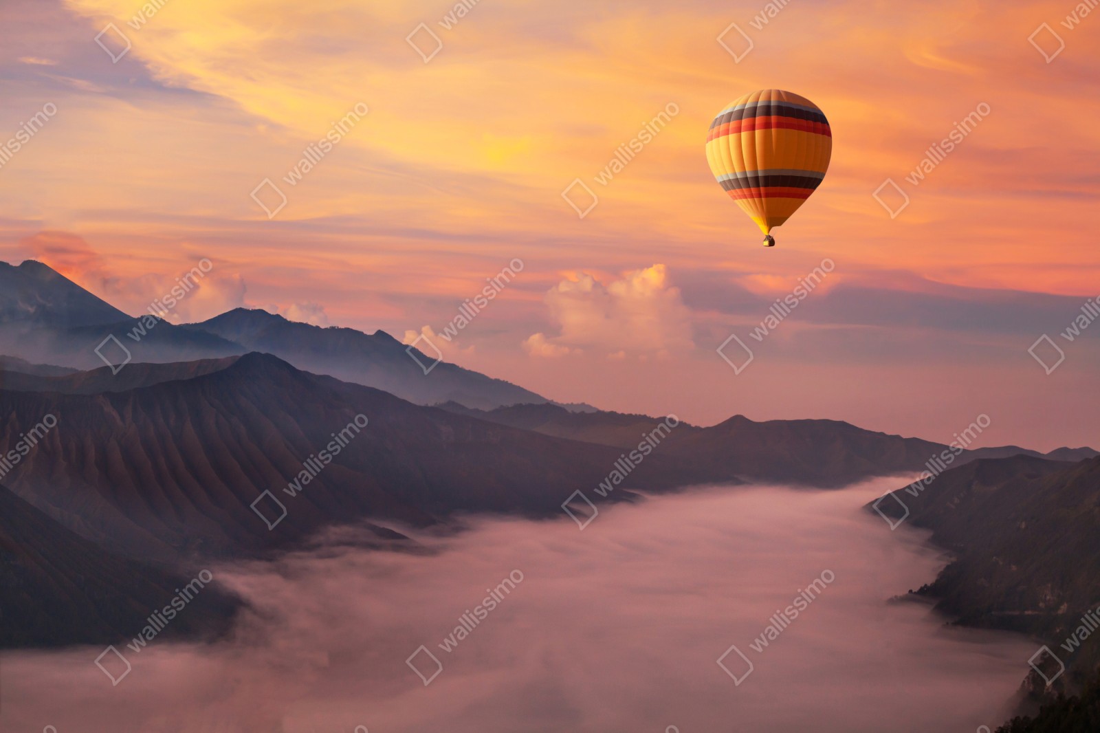 eine lebendige szene bei sonnenaufgang mit einem heißluftballon über nebligen bergen, die wärme und ruhe in jeden raum bringt.