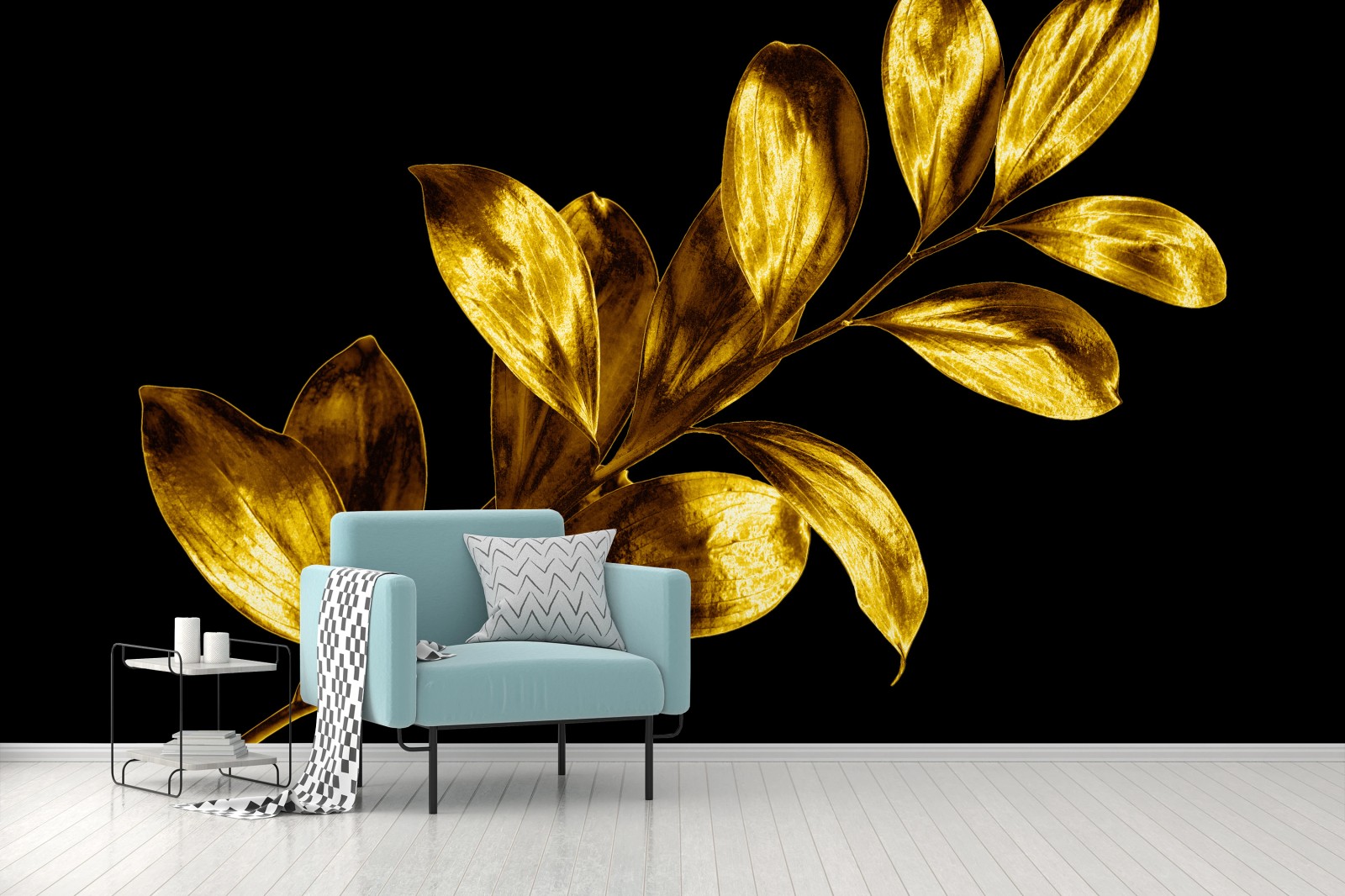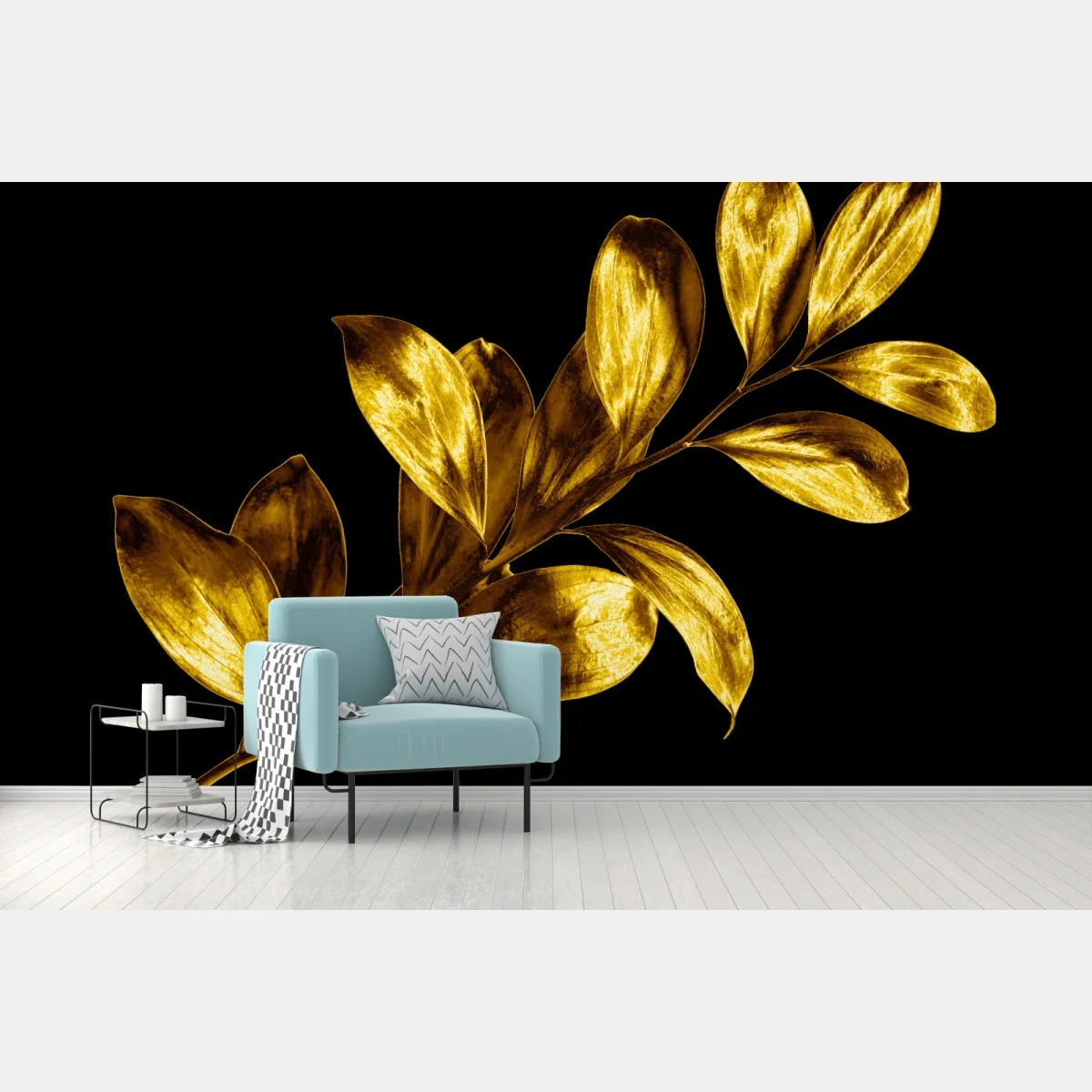 Fototapete Goldener blattzweig auf schwarzem hintergrund