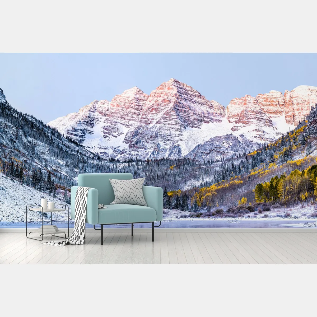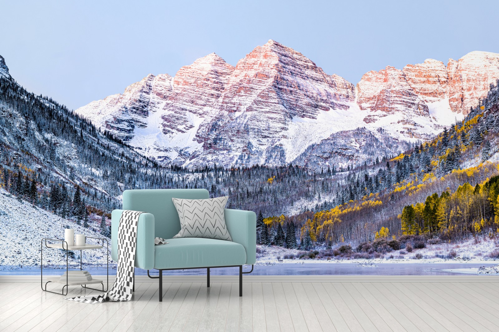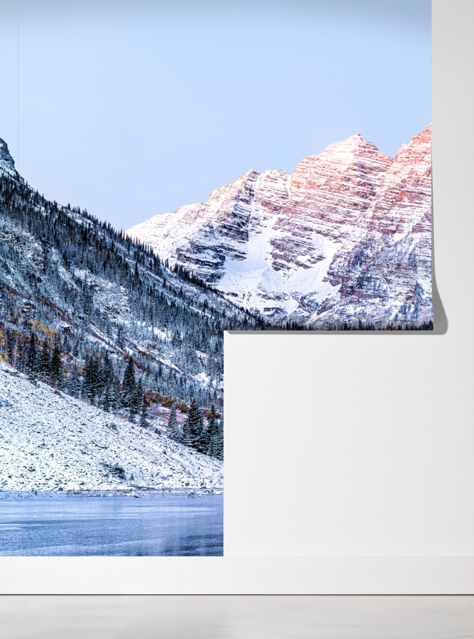 Fototapete verschneiter morgen in den bergen am see – Wallnifity®