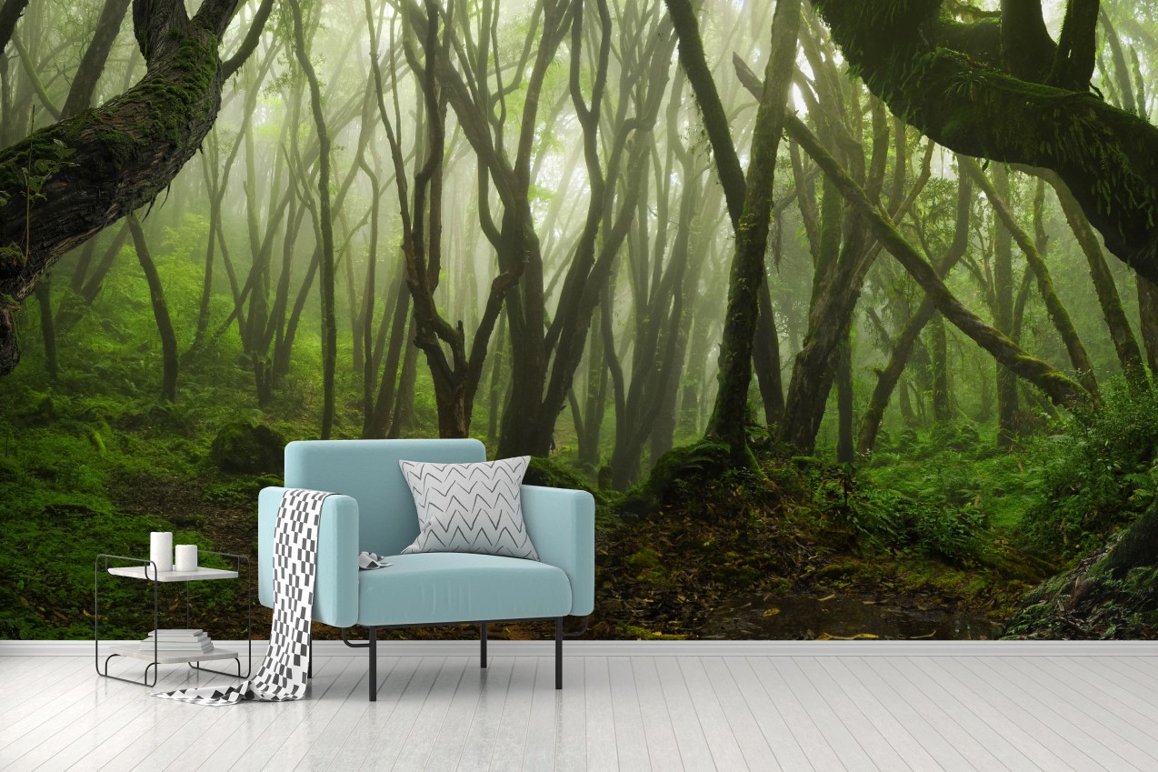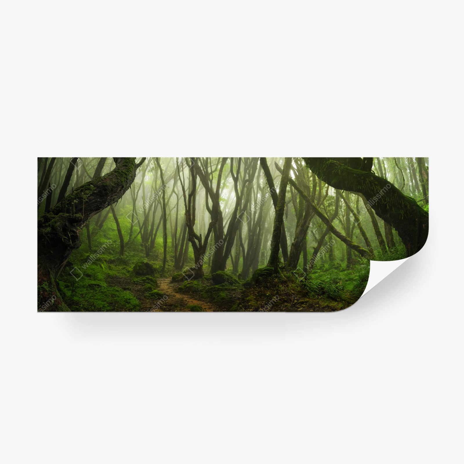 Fototapete Nebliger grüner waldpfad