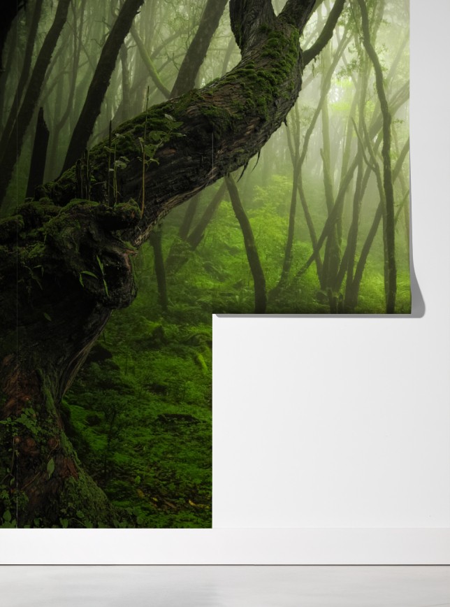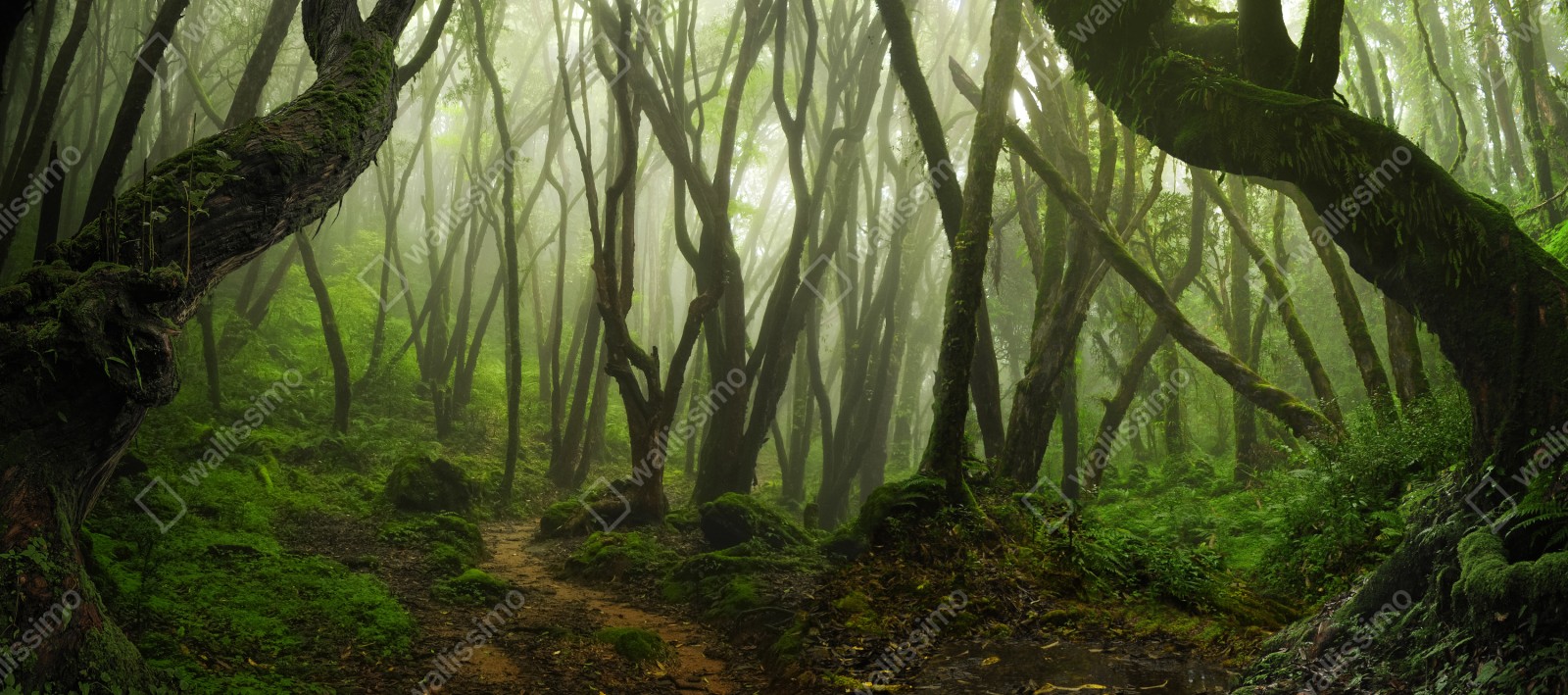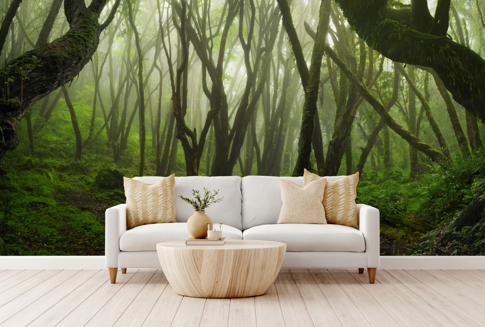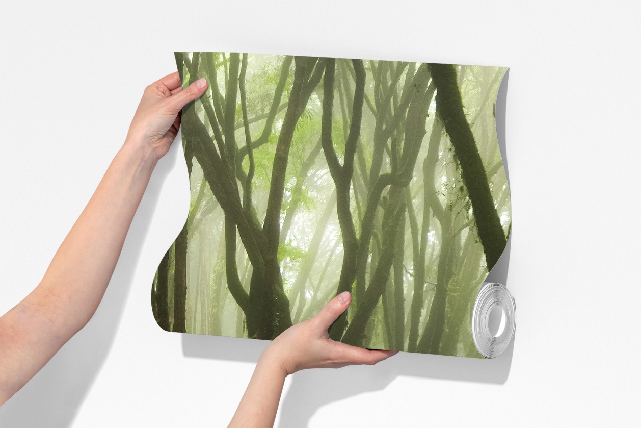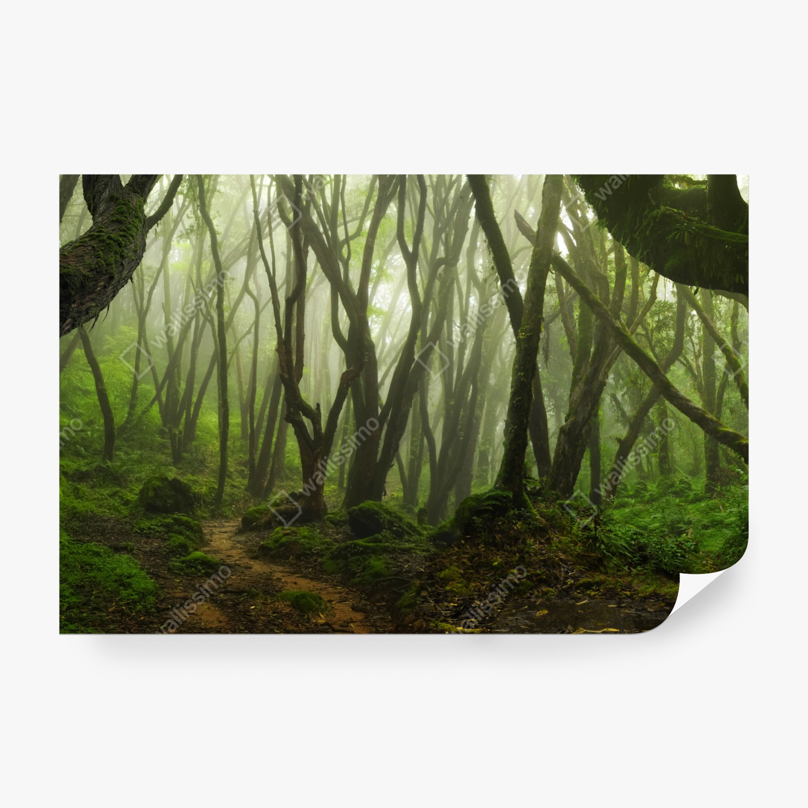 Eine ruhige neblige Waldszene mit moosbedeckten Bäumen und einem gewundenen Pfad, perfekt um natürliche Ruhe ins Zuhause zu bringen.