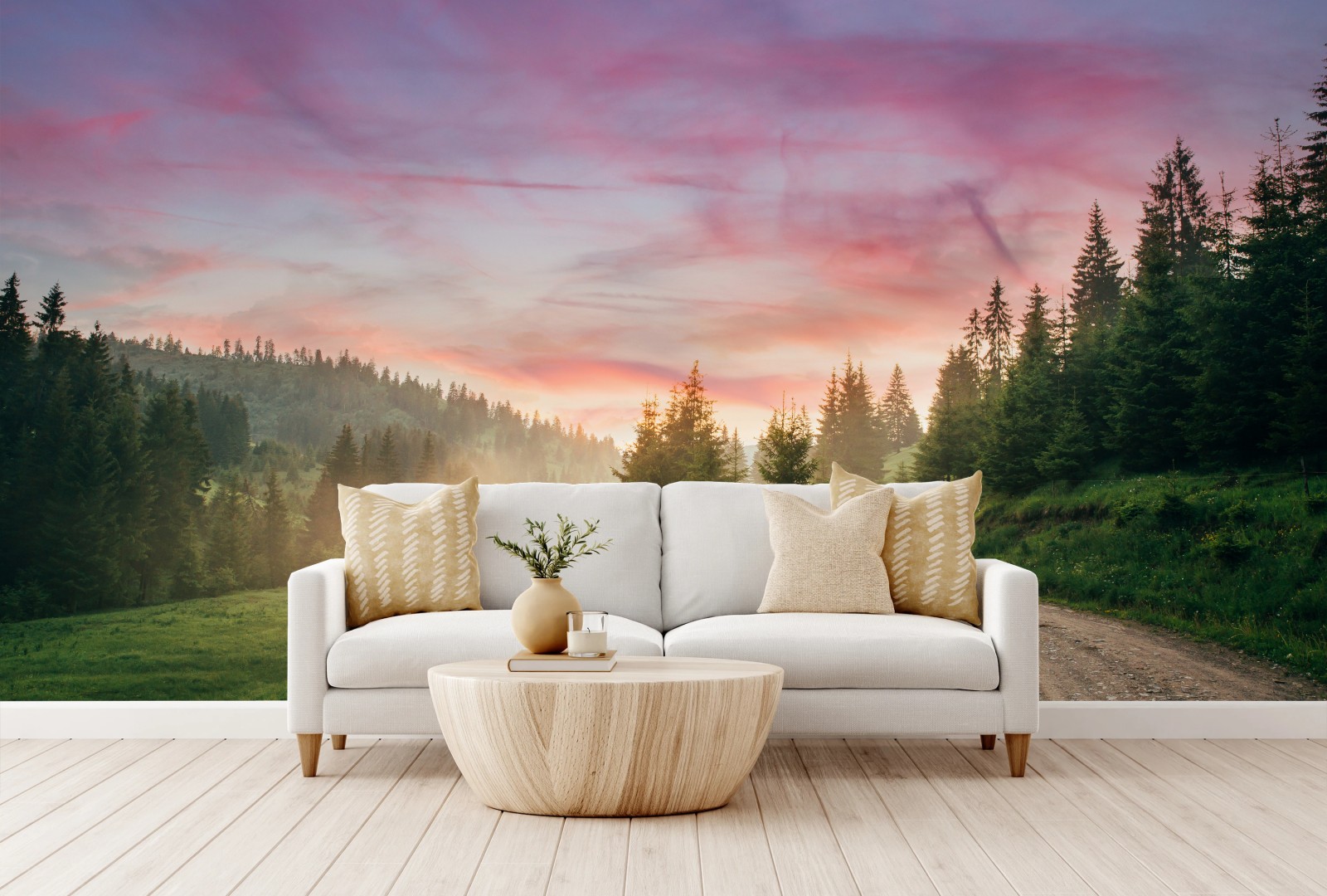 Fototapete Nebliger sonnenuntergang im kiefernwald
