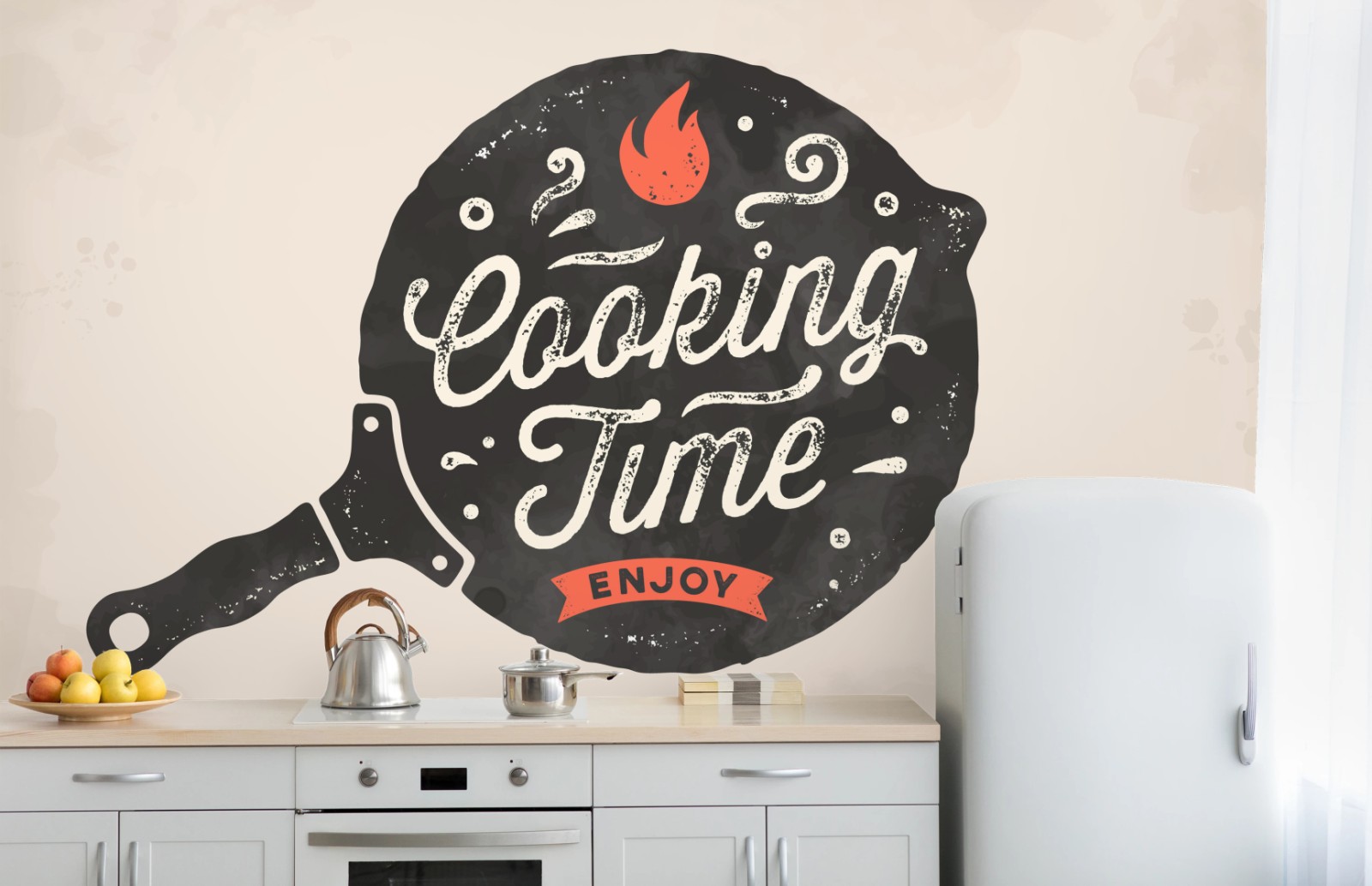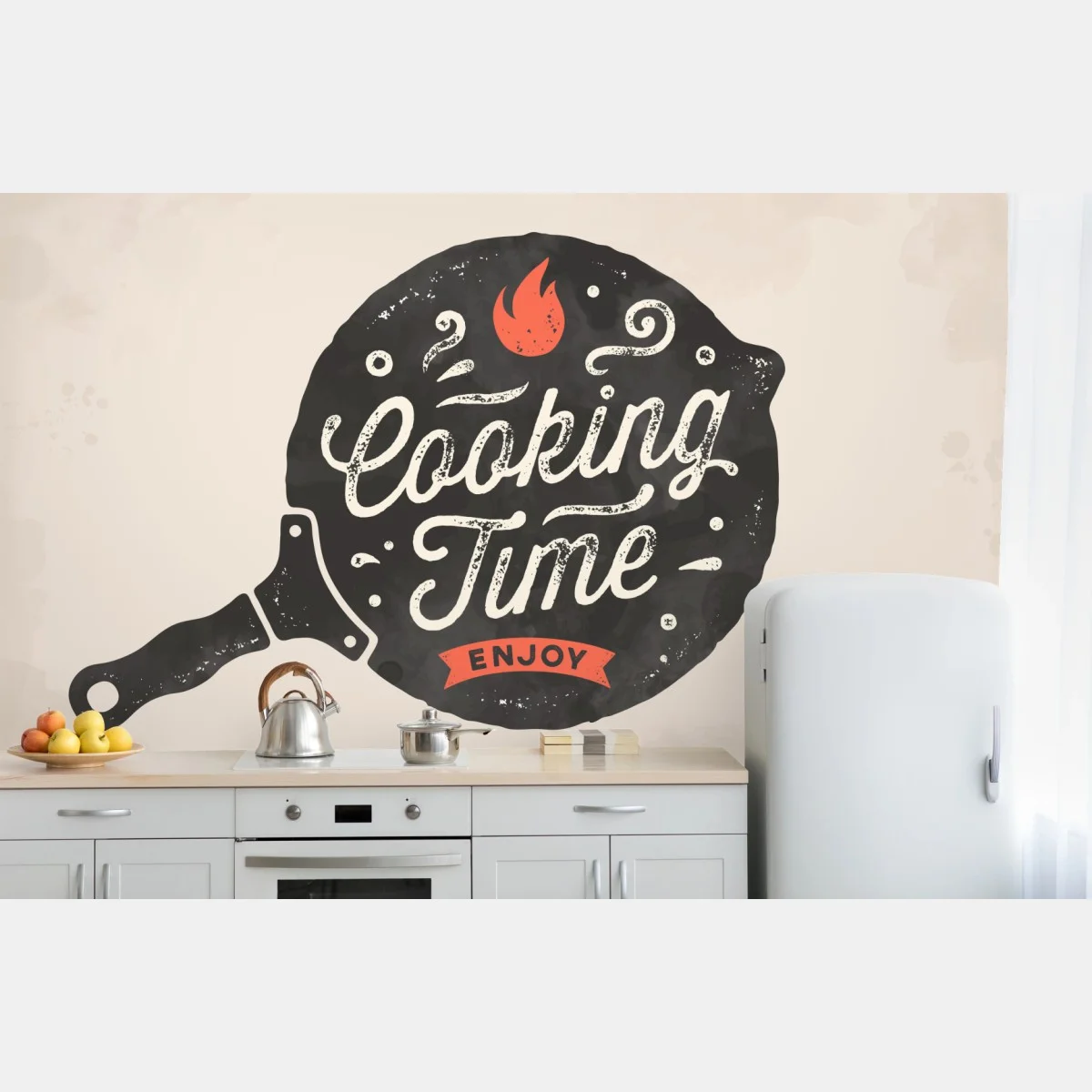 Retro-Illustration einer Pfanne mit handgezeichnetem 'cooking time'-Schriftzug verleiht jeder Küche warmen Vintage-Charme.MehrWeniger