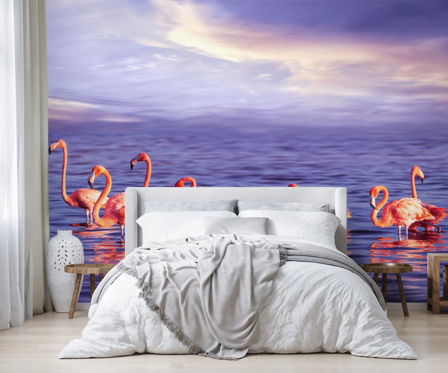 Fototapete Rosa flamingos im violetten sonnenuntergang