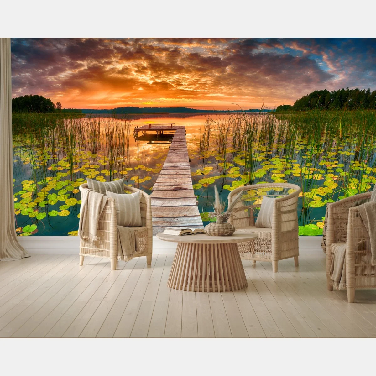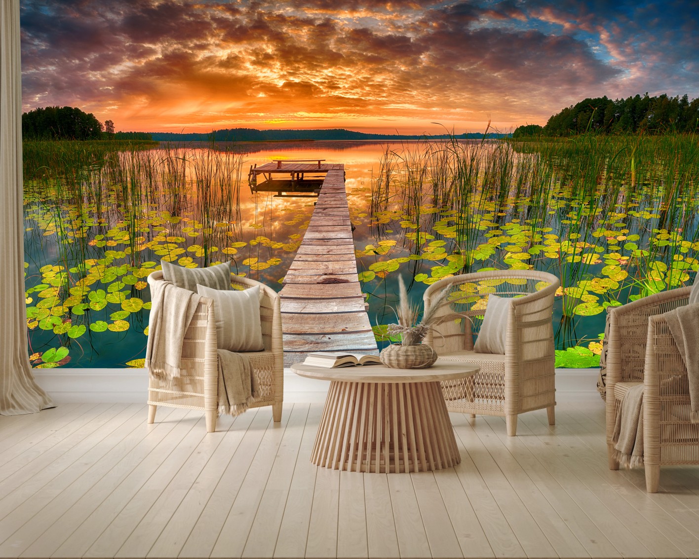 Fototapete Sonnenaufgang über stillem see mit hölzernem steg