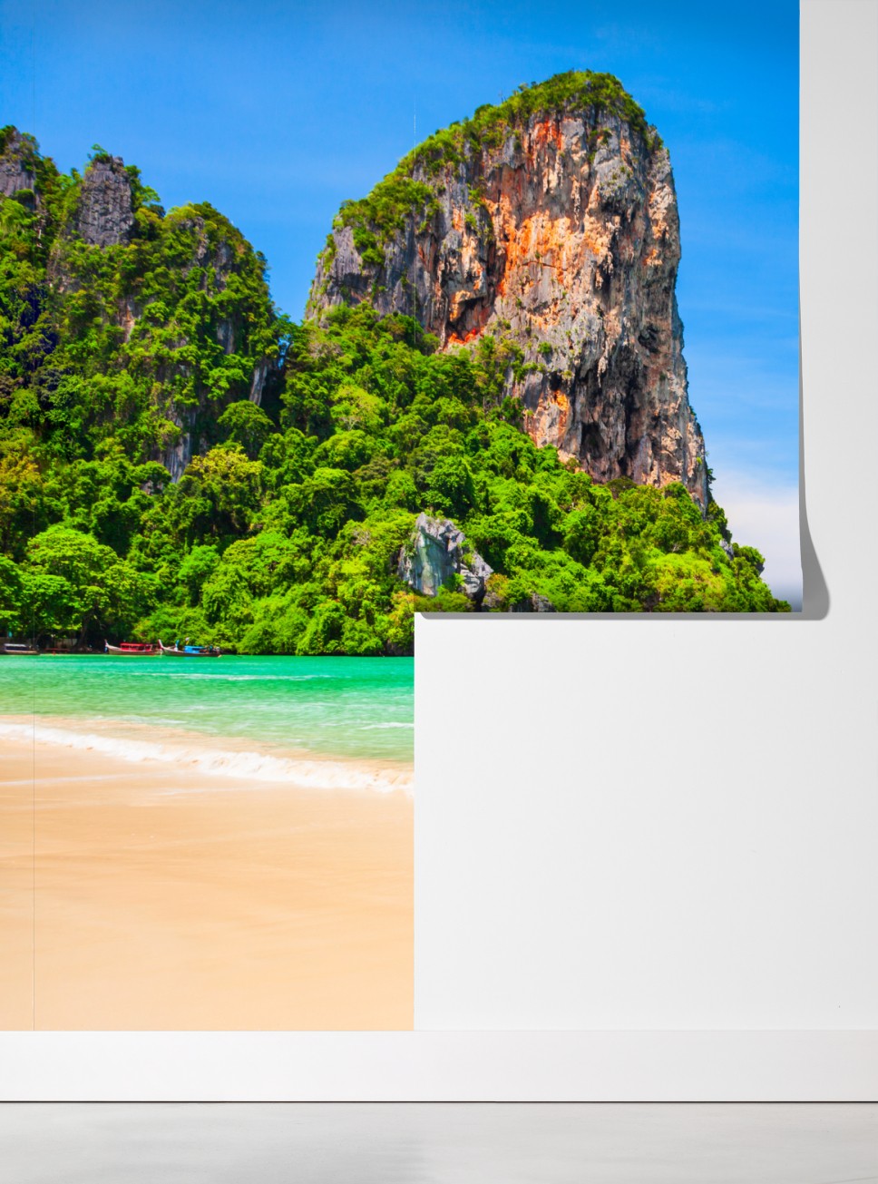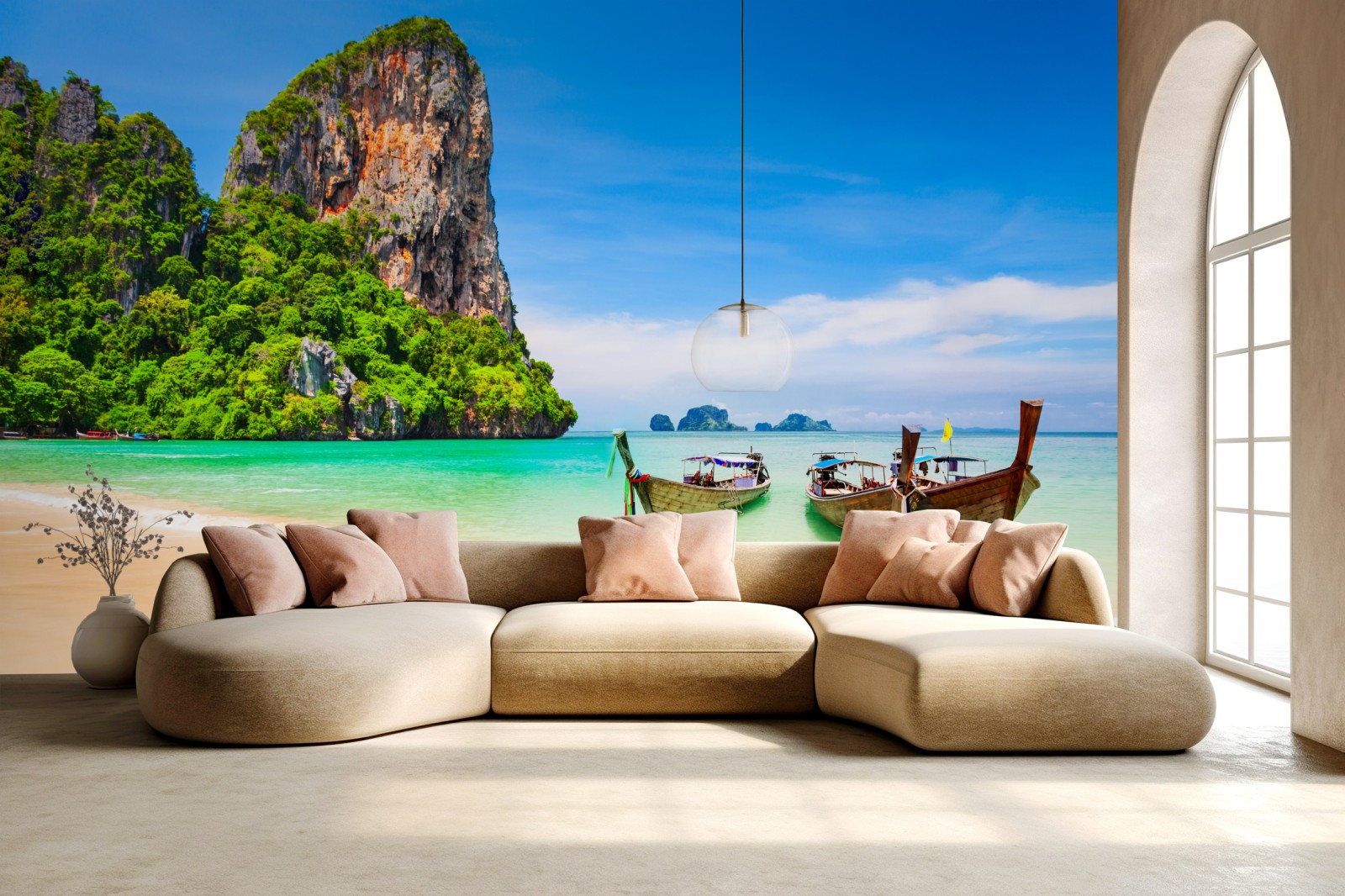 Lebendige tropische Meereslandschaft mit türkisblauem Wasser, hohen Kalksteinfelsen und traditionellen Booten, die Urlaubsstimmung in jeden Raum bringt.