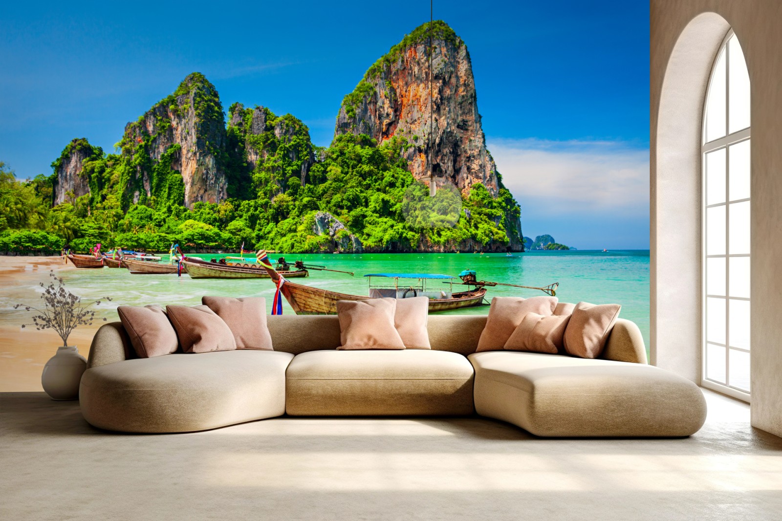Fototapete Longtail-boote an einem tropischen strand, Thailand